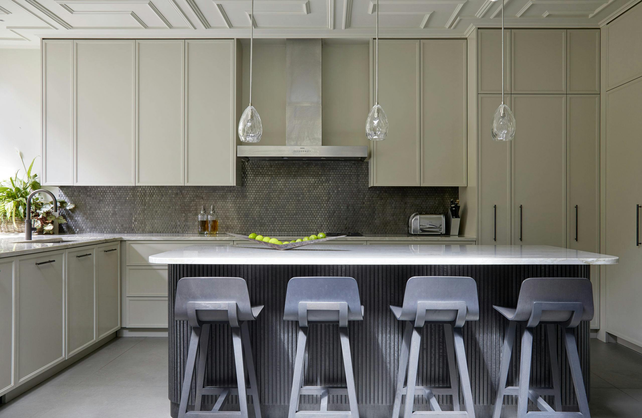 Four zones were subtly established through beautiful bespoke kitchen cabinetry, a timber-clad island, mid-century dining furniture, and a stylish vintage Roche Bobois corner sofa upholstered in Chanel boucle fabric.