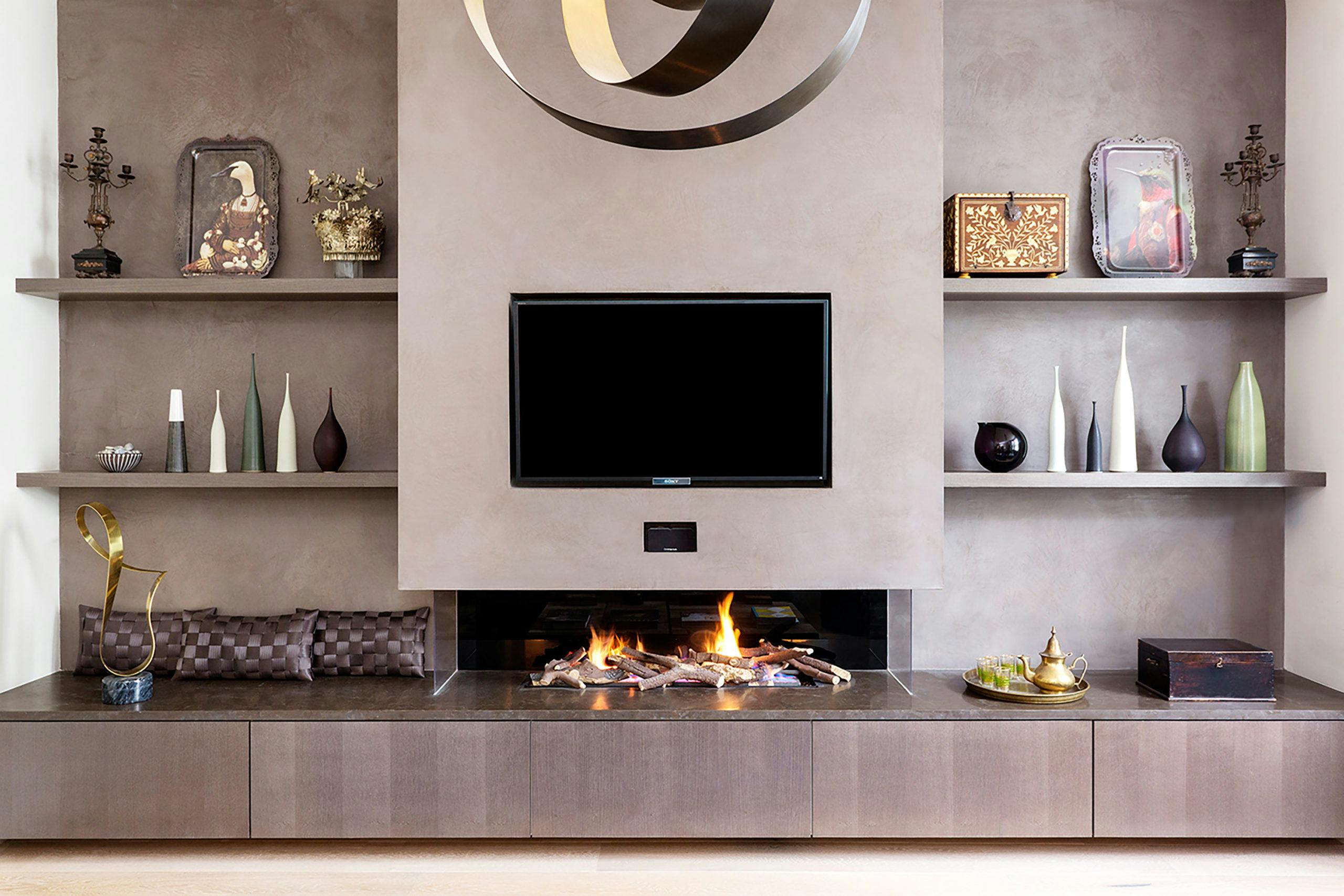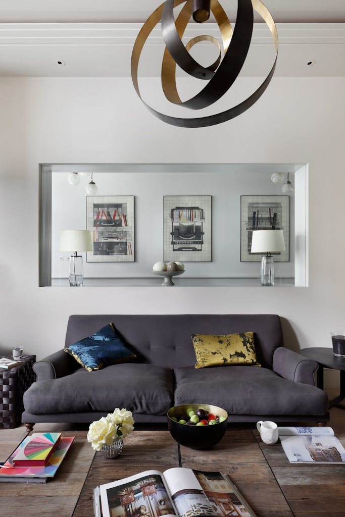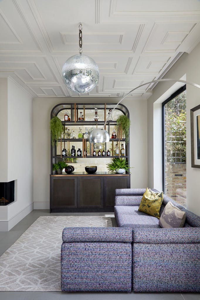 The sitting room is cosy yet sophisticated, with a clever lighting scheme and sumptuous finishes, such as polished plaster walls and a mohair rug. A glass panel in the wall ensures the room has plenty of natural light.