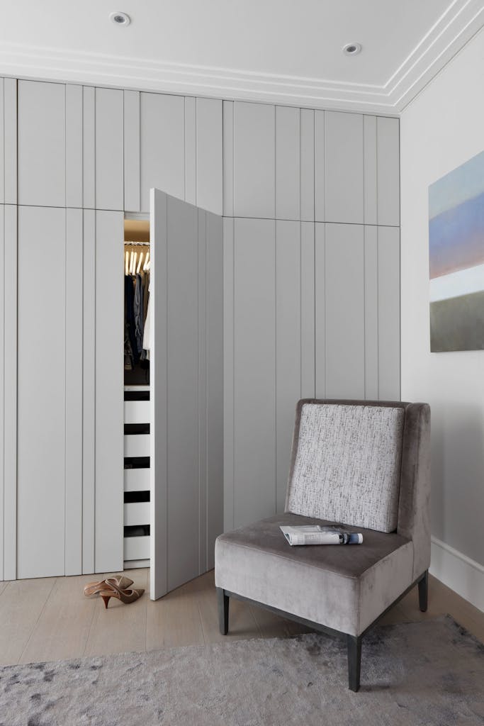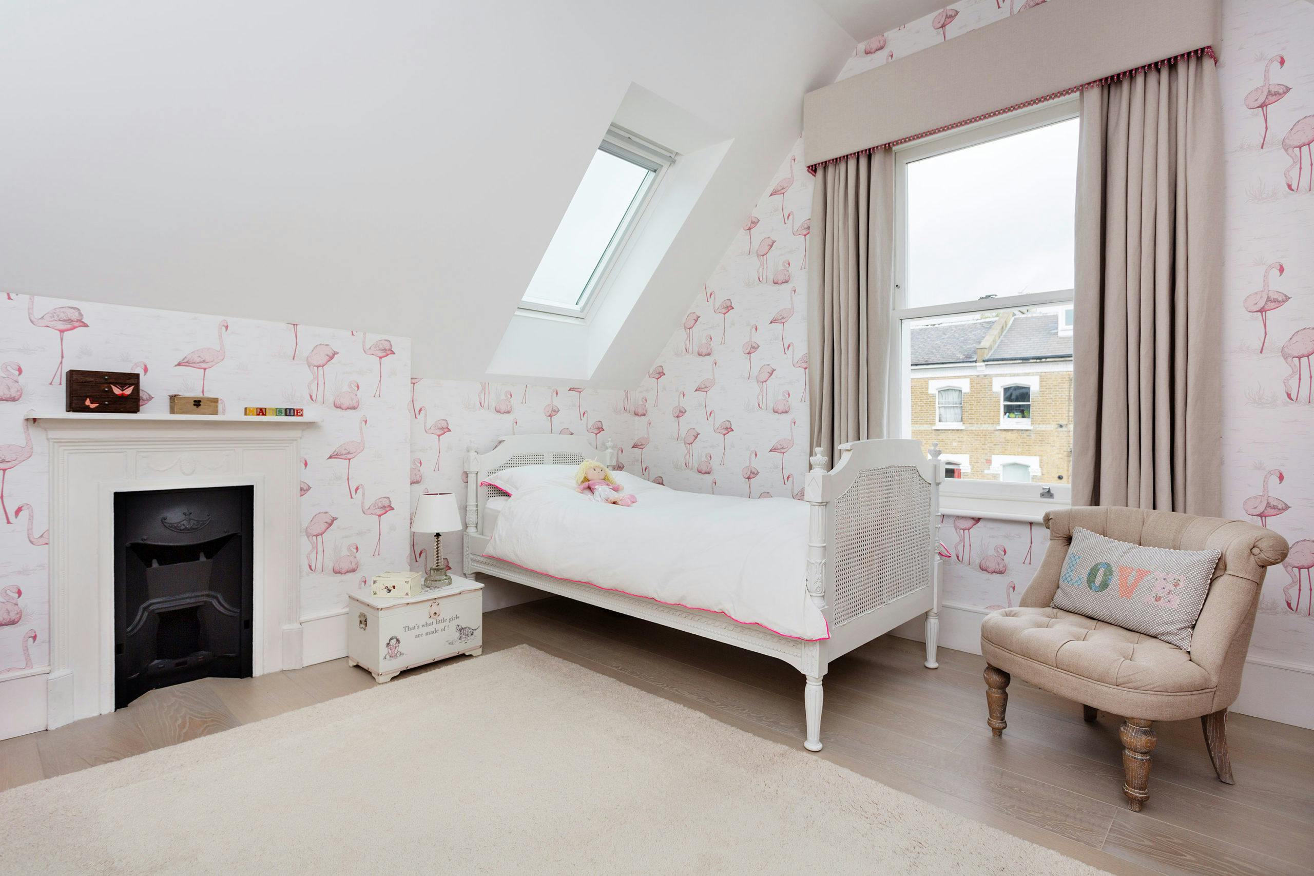 On the second floor, in the children’s bedrooms, there’s a fresh Scandinavian feel, with pale, neutral palettes, pretty designer wallpapers and carefully sourced vintage pieces. Bespoke wardrobes utilise the sloped ceiling space in these charming rooms.