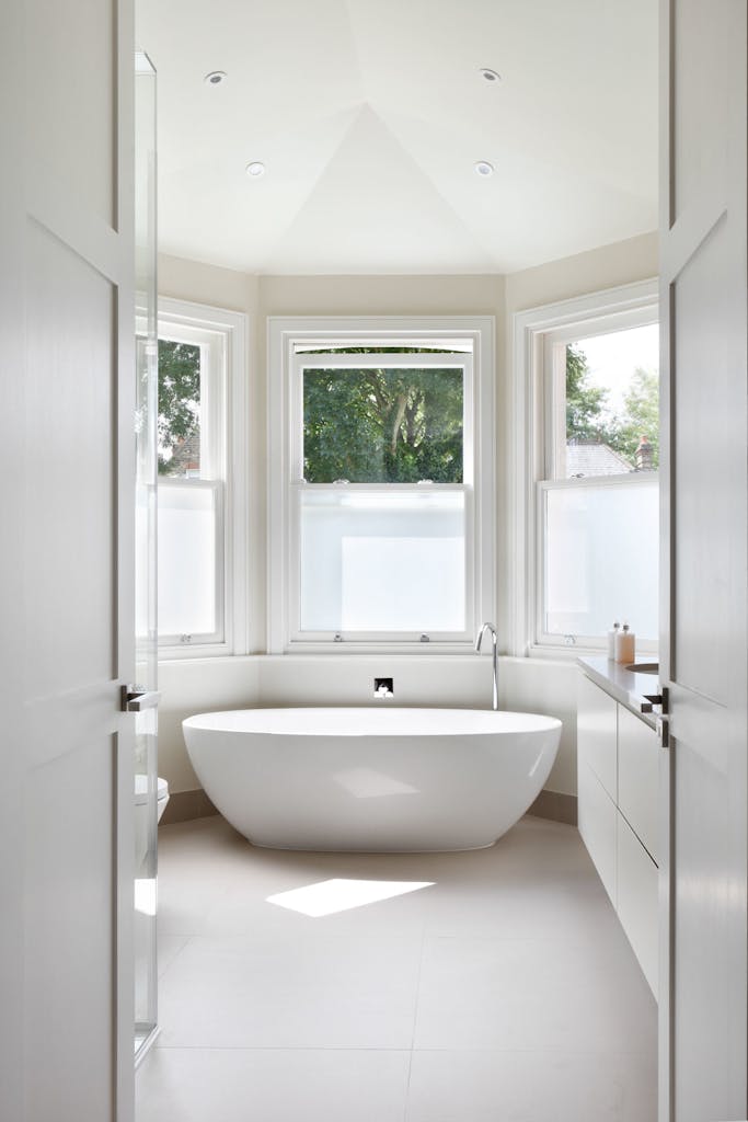 On the first floor, in the master bedroom, a feature wall reveals bespoke floor-ceiling wardrobes, while double doors open onto a large, luxurious en-suite, where bay windows beautifully frame a freestanding oval bath for a spa-like feel.