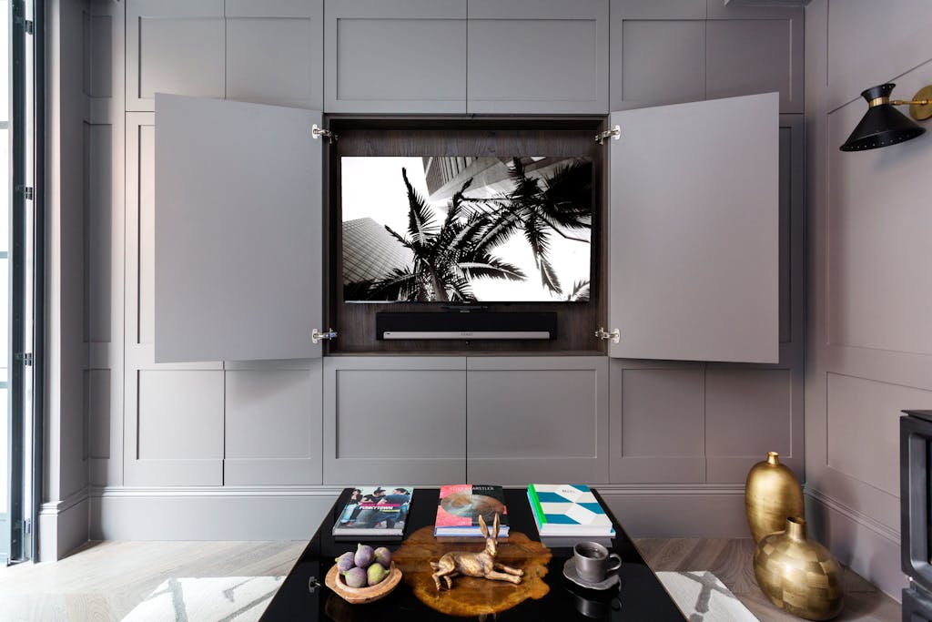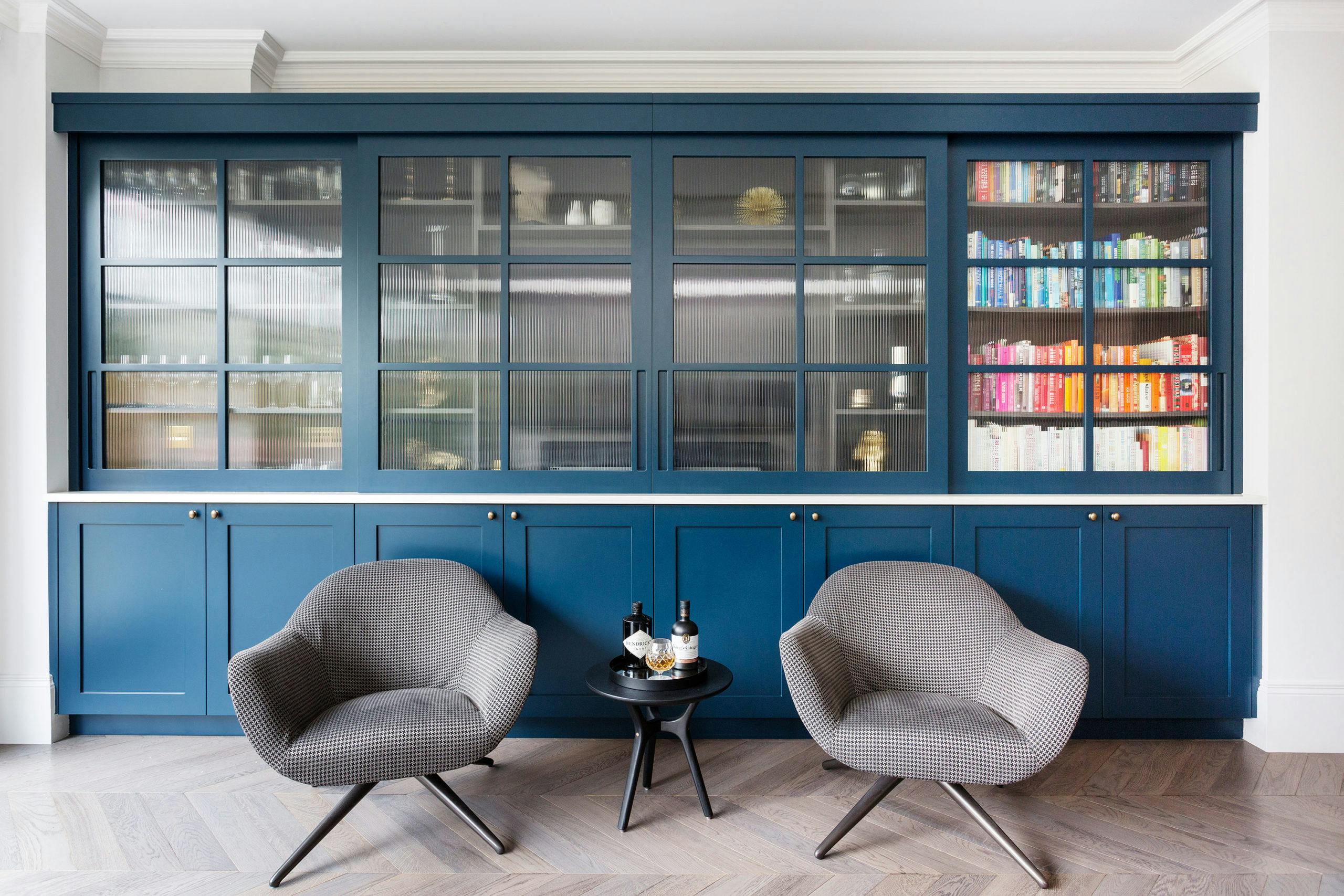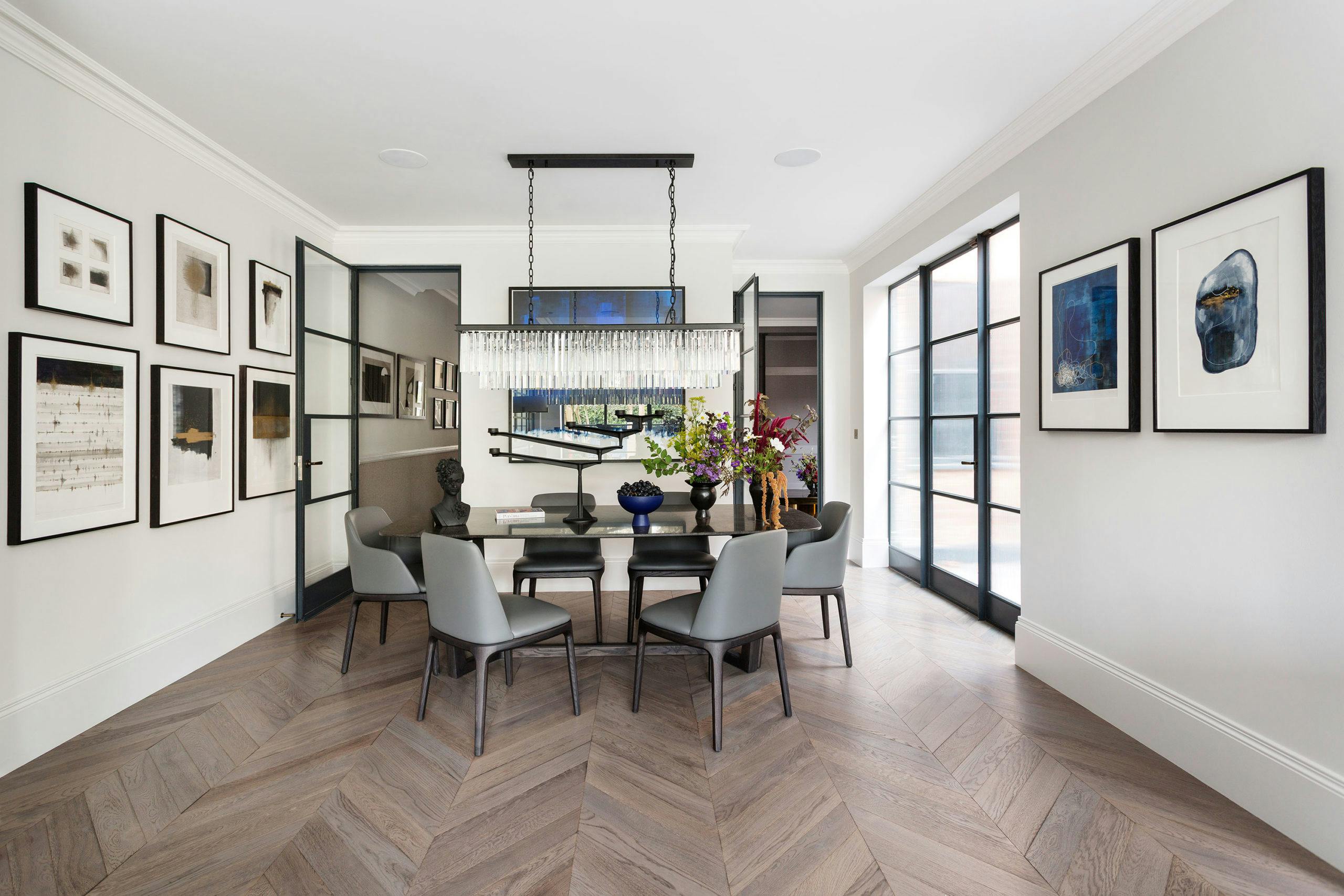 Bespoke cabinetry designed by HUX London provides ample storage, and on one section beautiful fluted glass panels hide a TV. The cabinetry is complemented by a spectacular book-matched marble splash-back, and timber, parquet flooring, which extends throughout the ground floor
