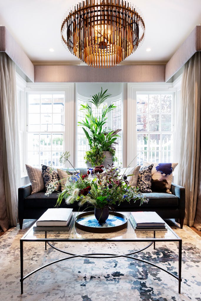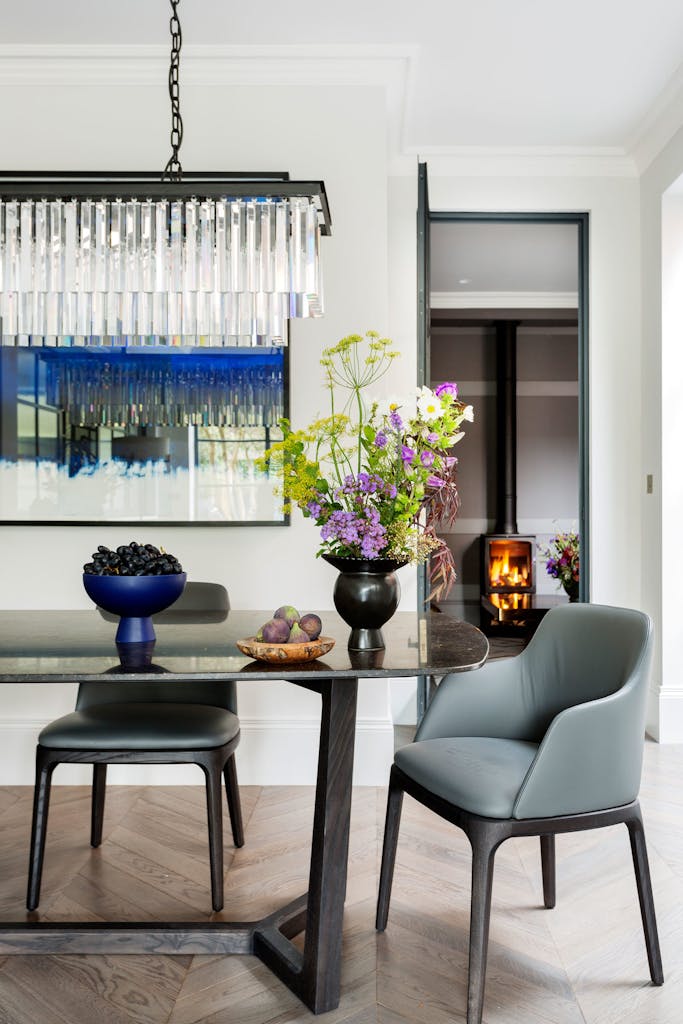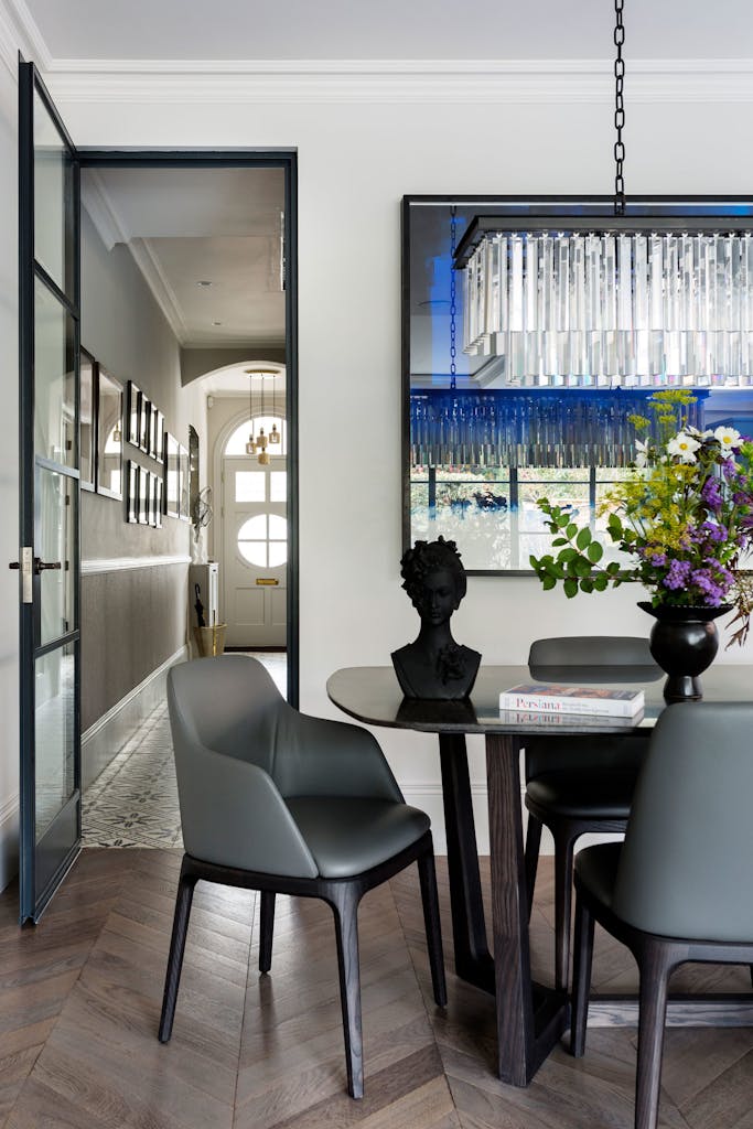 Our design team reconfigured the ground floor and added a small rear and side extension to open the space for a huge kitchen and dining area, with a bank of Crittall windows leading to the garden (redesigned by Ruth Willmott).