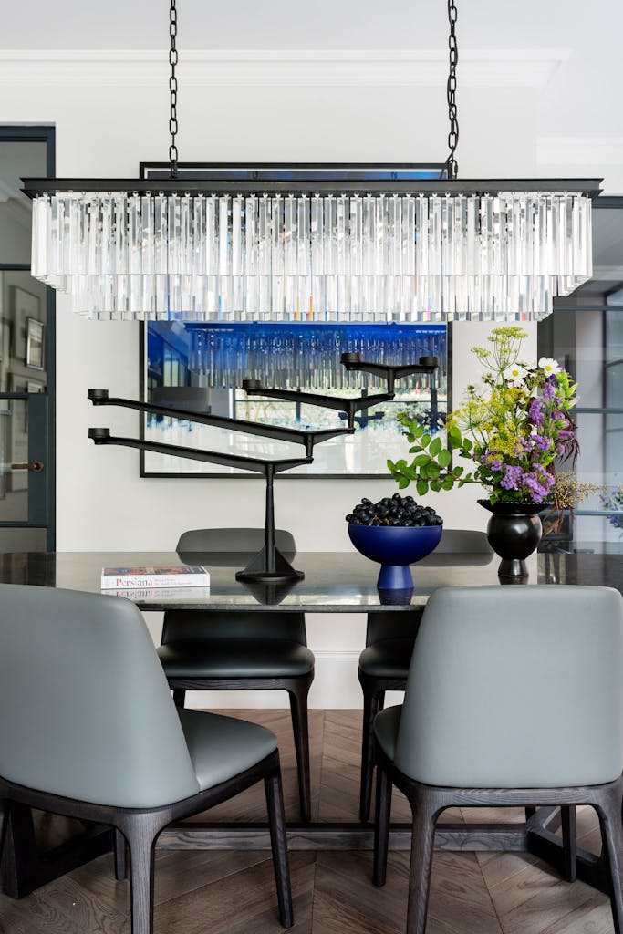 The open kitchen area incorporates a glamorous dining table by Marcel Wanders, which the family use every day.