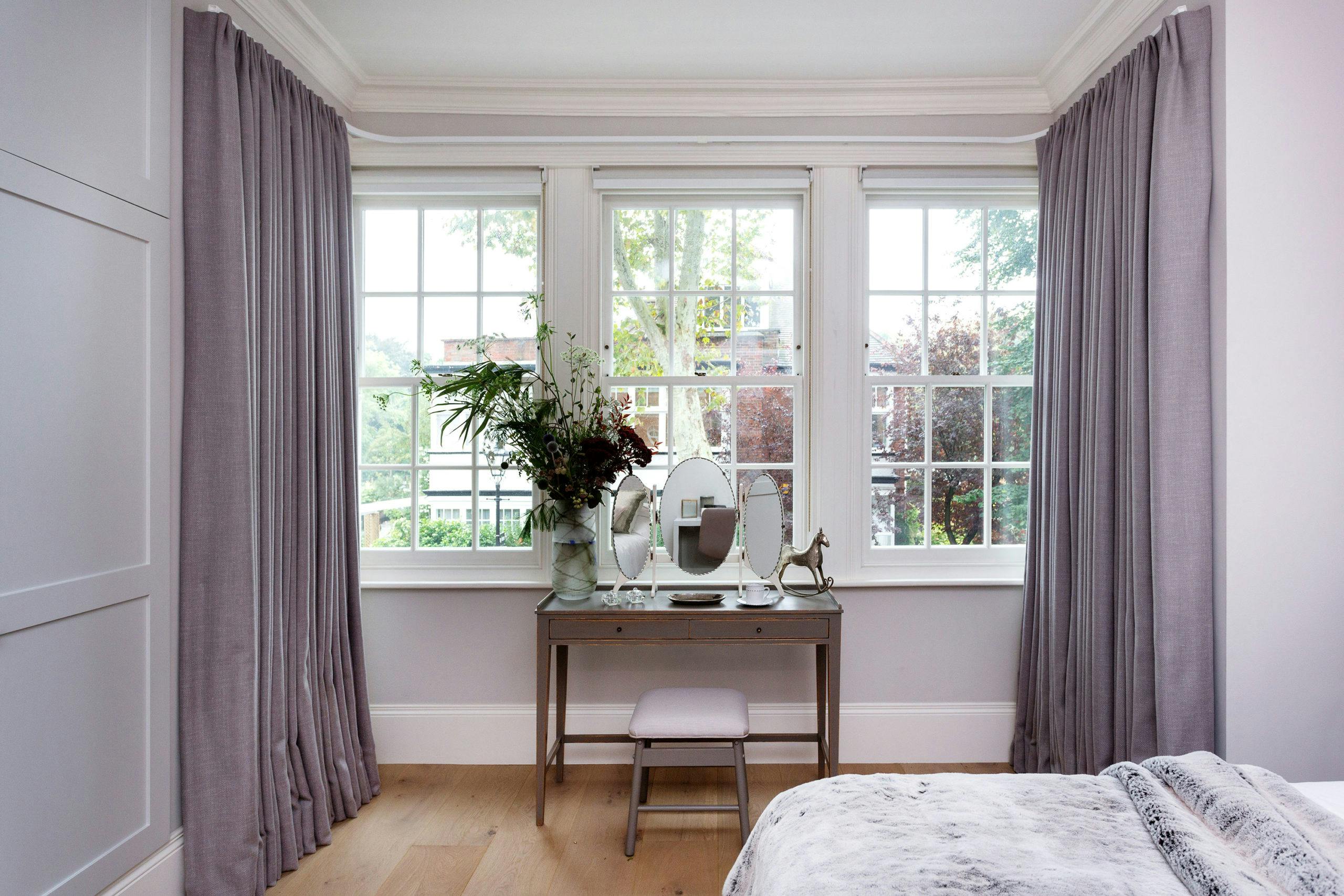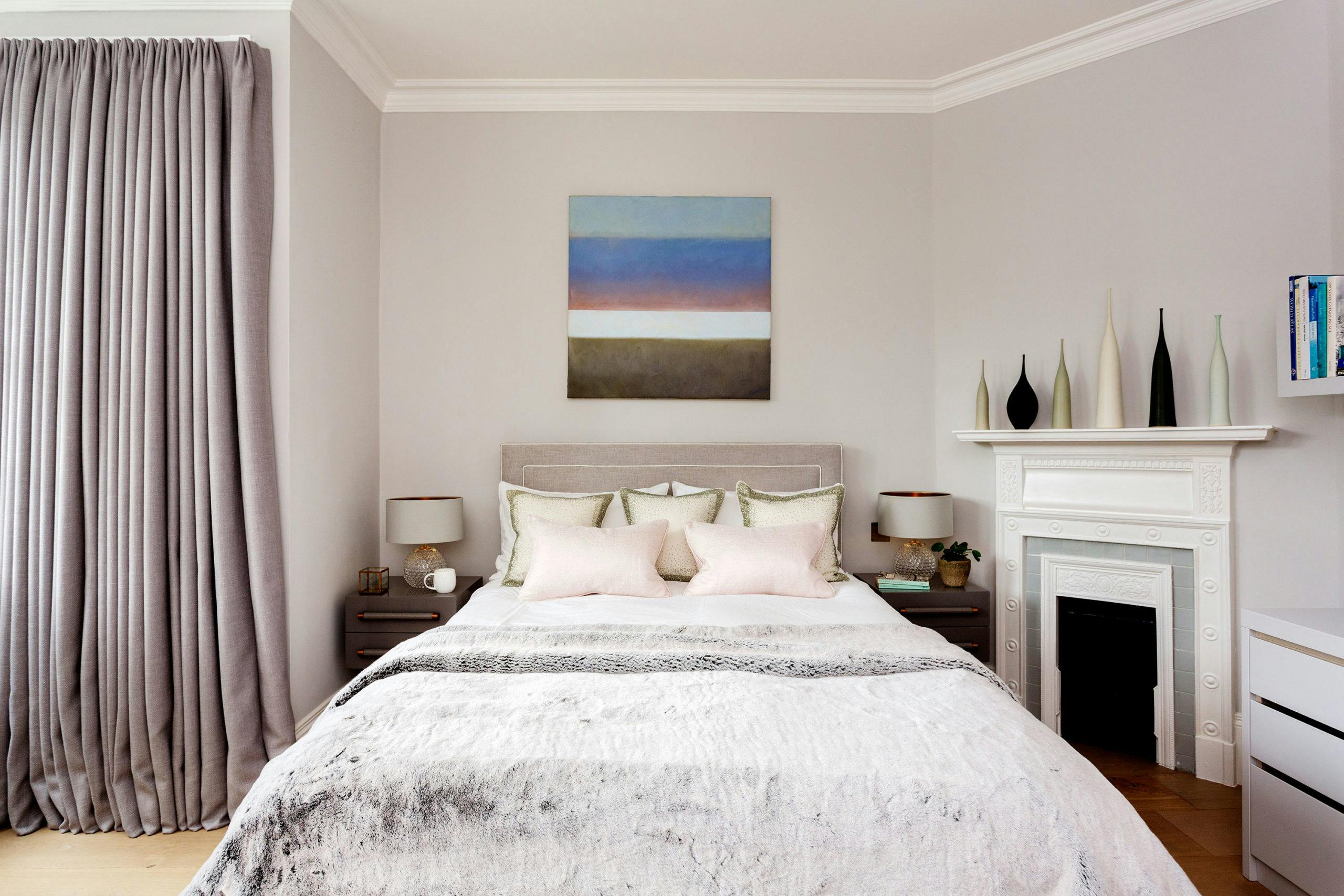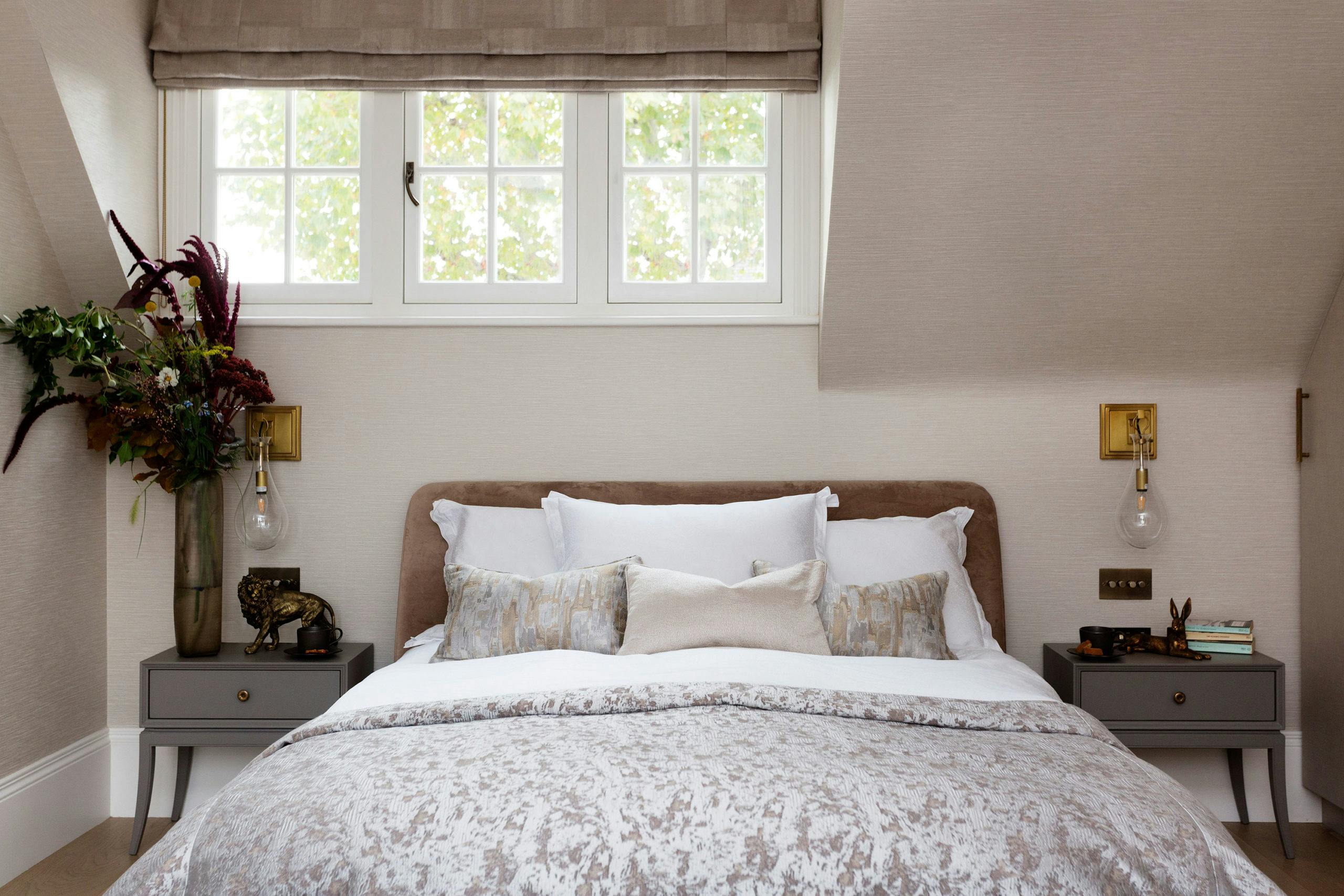 In the master suite on the second floor, the sloping ceilings were maximised with bespoke wardrobes by HUX London, while a calming scheme was created with soft, neutral tones and rich textures and leads to a gorgeous marble-clad en-suite bathroom. The couple now have their own dedicated study, a streamlined bespoke double desk and cabinetry. It has a comfortable elegant feel ideal for home working.