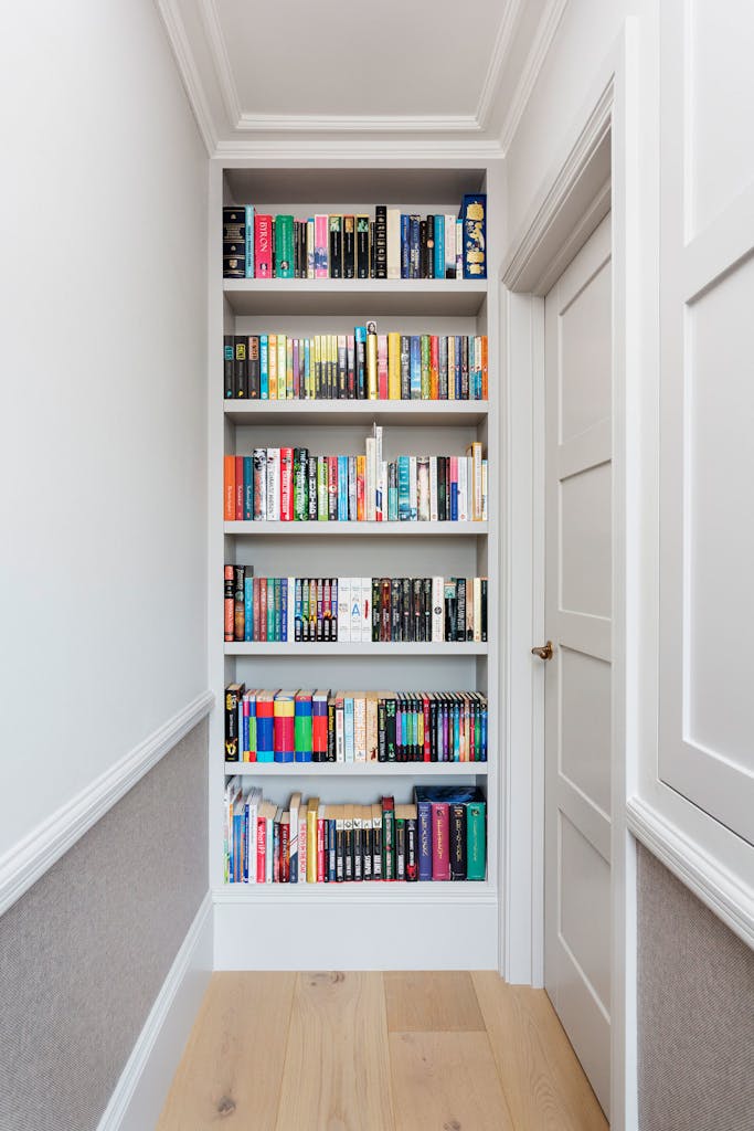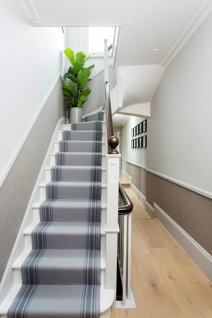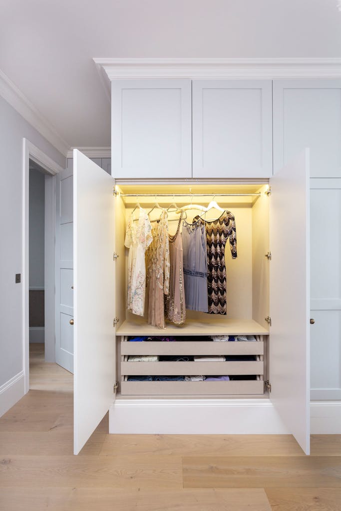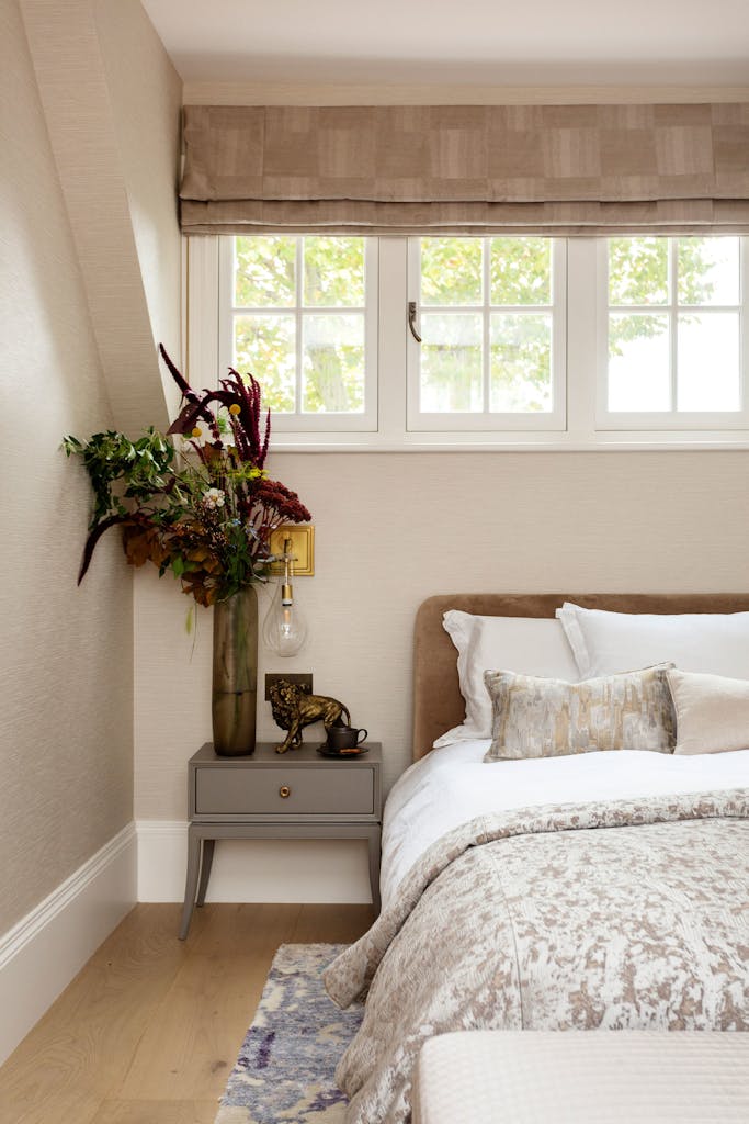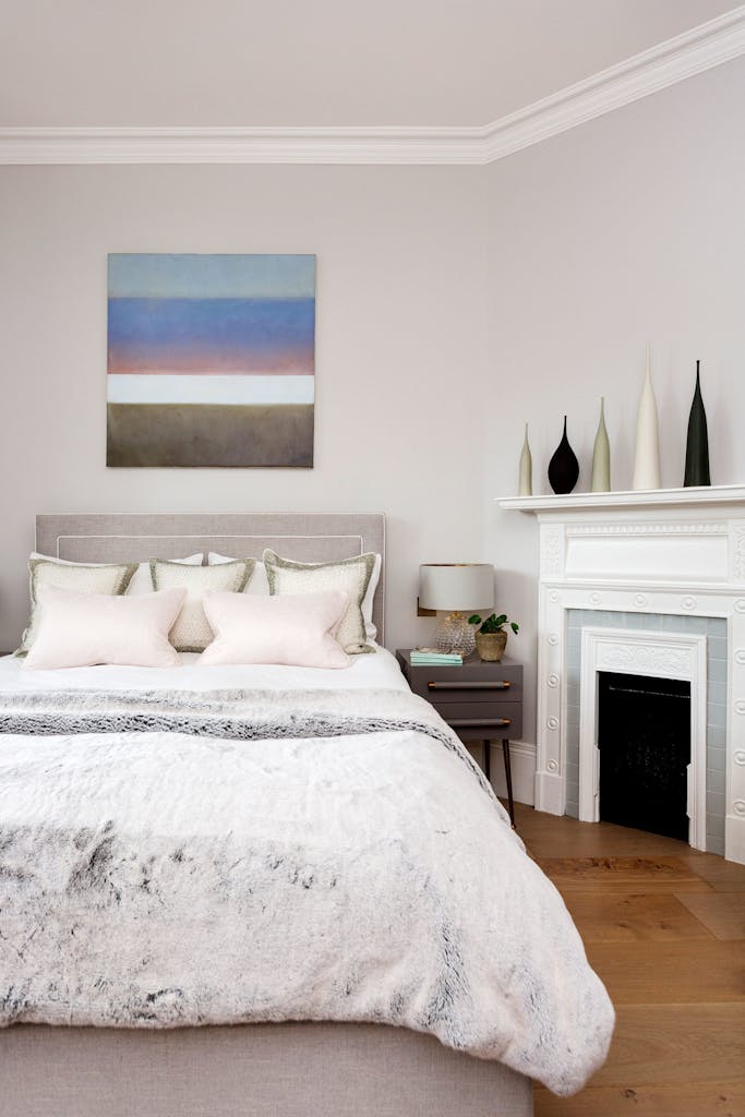 In the master suite on the second floor, the sloping ceilings were maximised with bespoke wardrobes by HUX London, while a calming scheme was created with soft, neutral tones and rich textures and leads to a gorgeous marble-clad en-suite bathroom. The couple now have their own dedicated study, a streamlined bespoke double desk and cabinetry. It has a comfortable elegant feel ideal for home working.