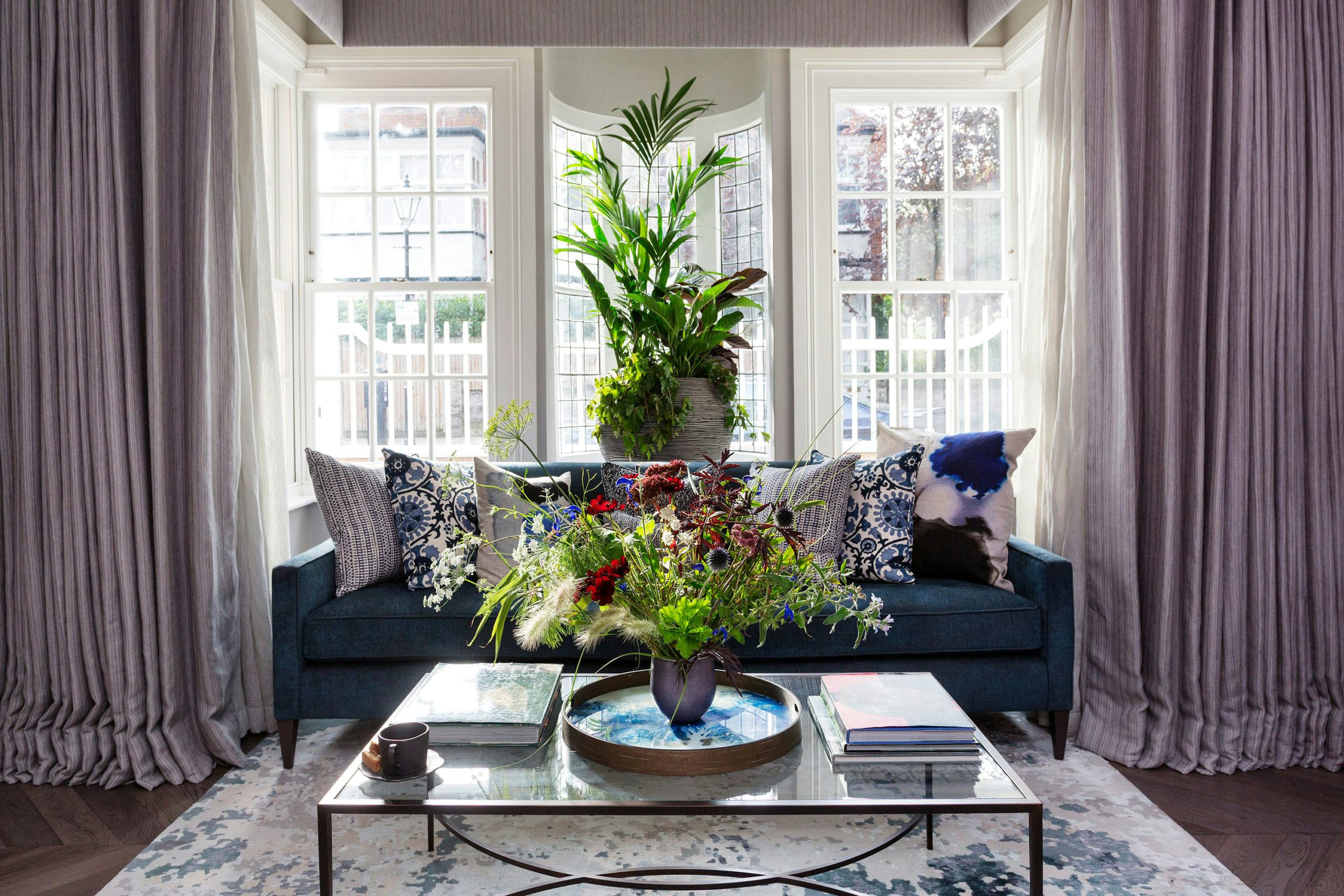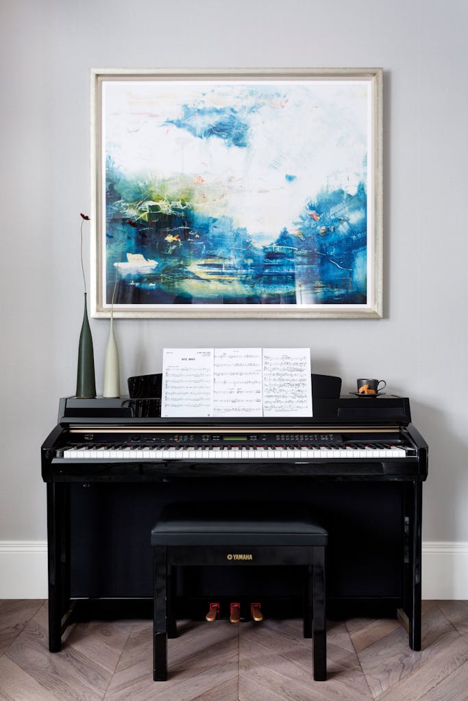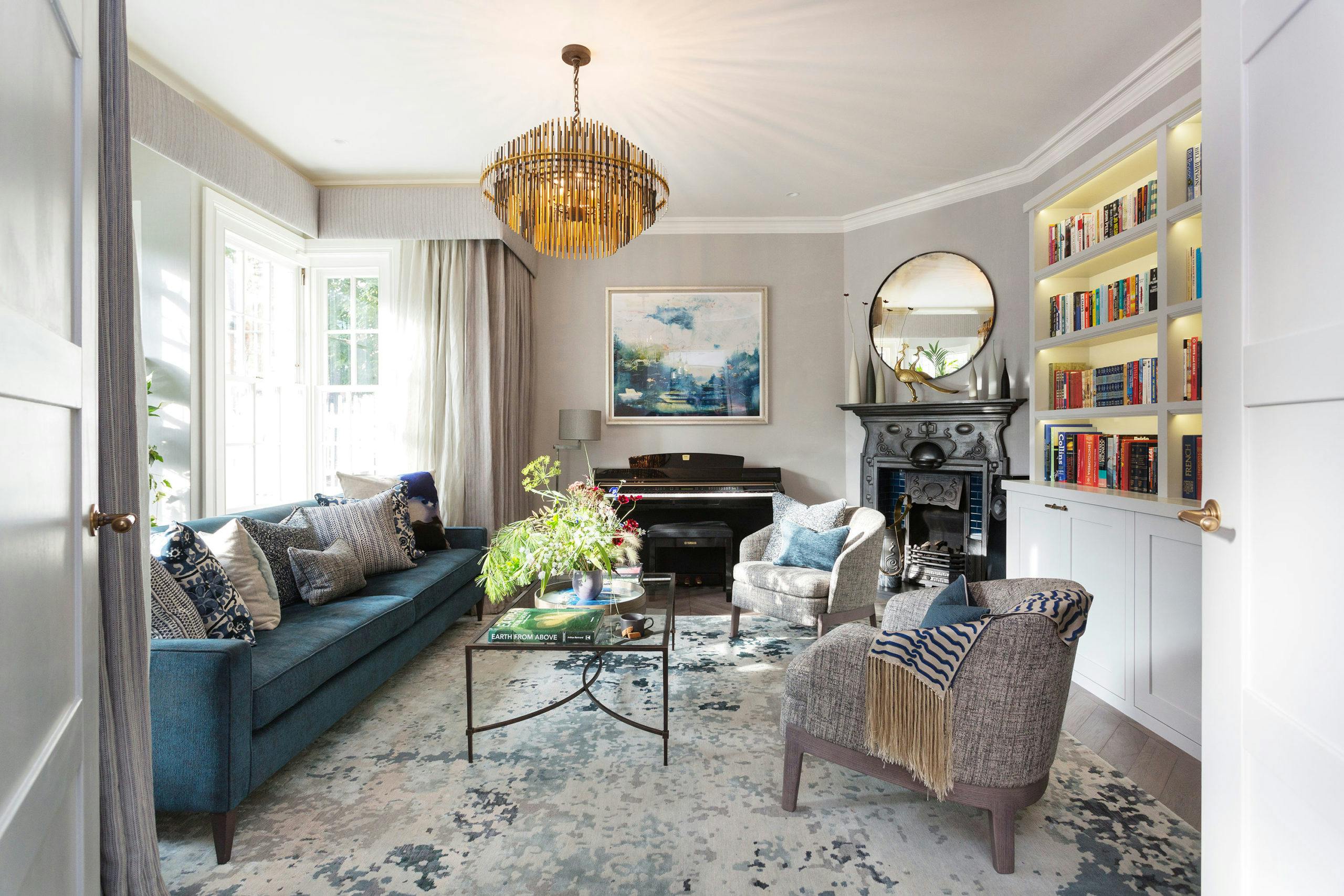 The formal sitting room is an elegant space where the family plays music. A sumptuous teal sofa, a hand-knotted silk and wool rug and a vibrant abstract artwork bring a fresh feel.