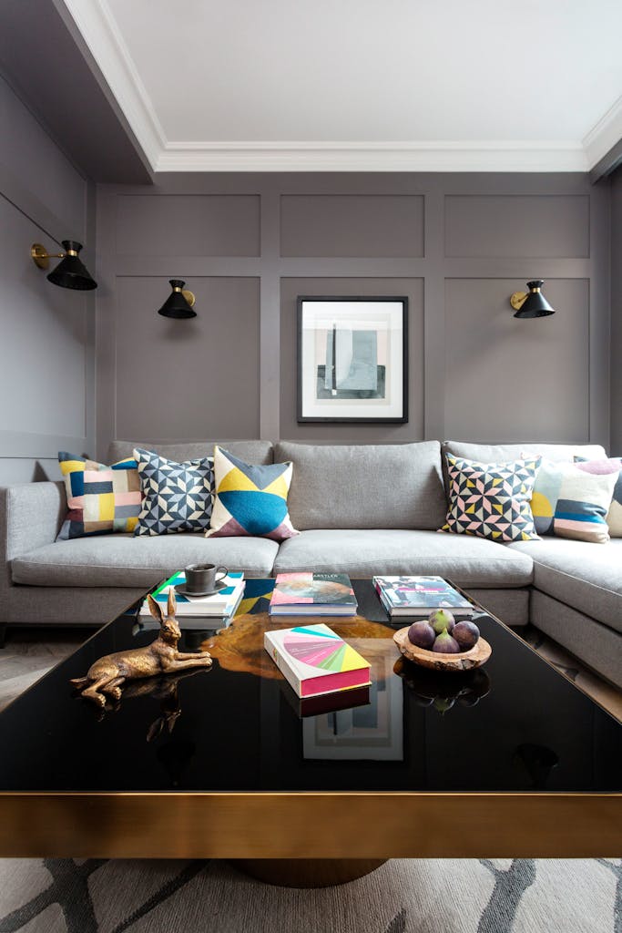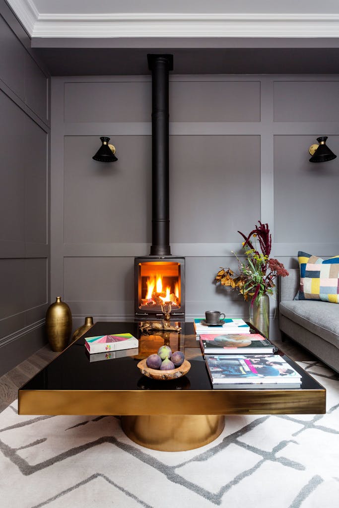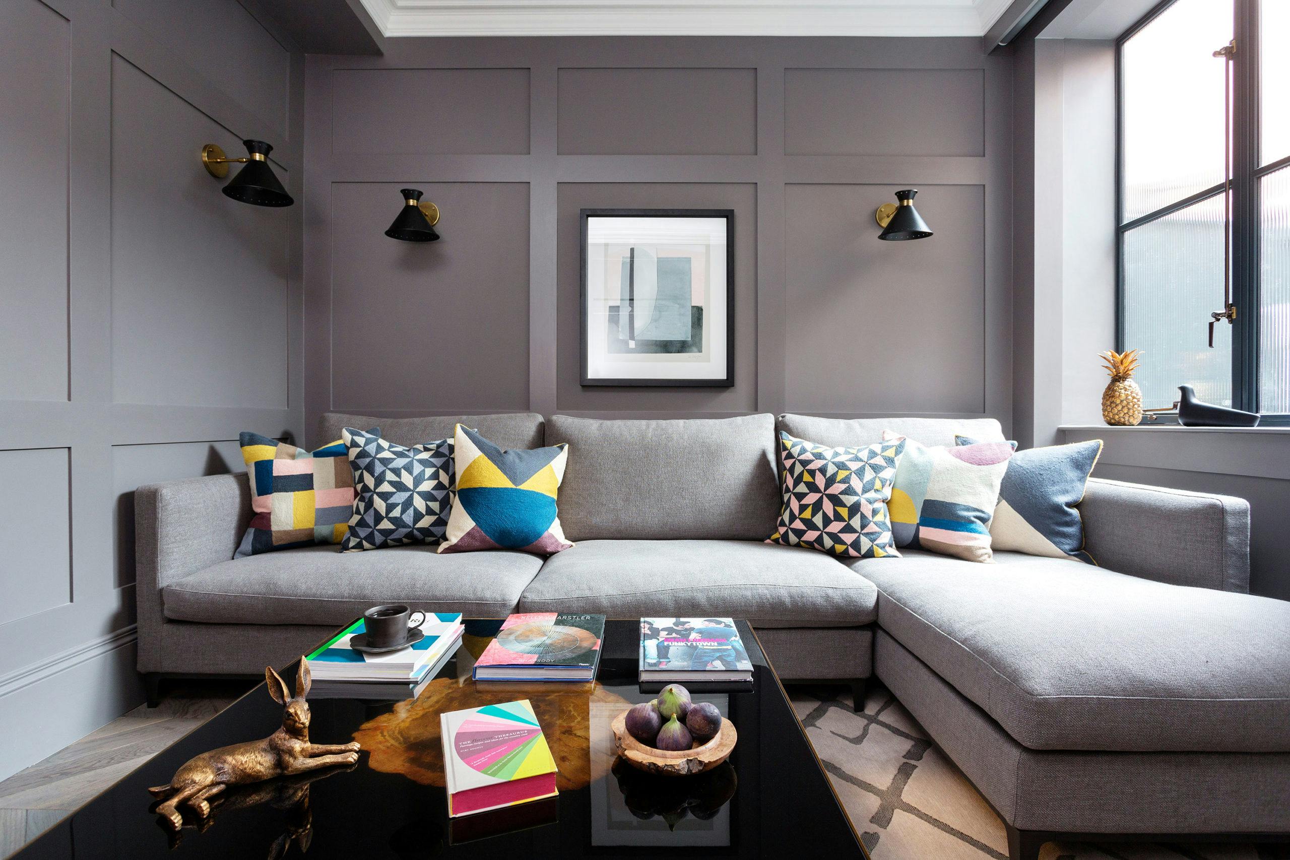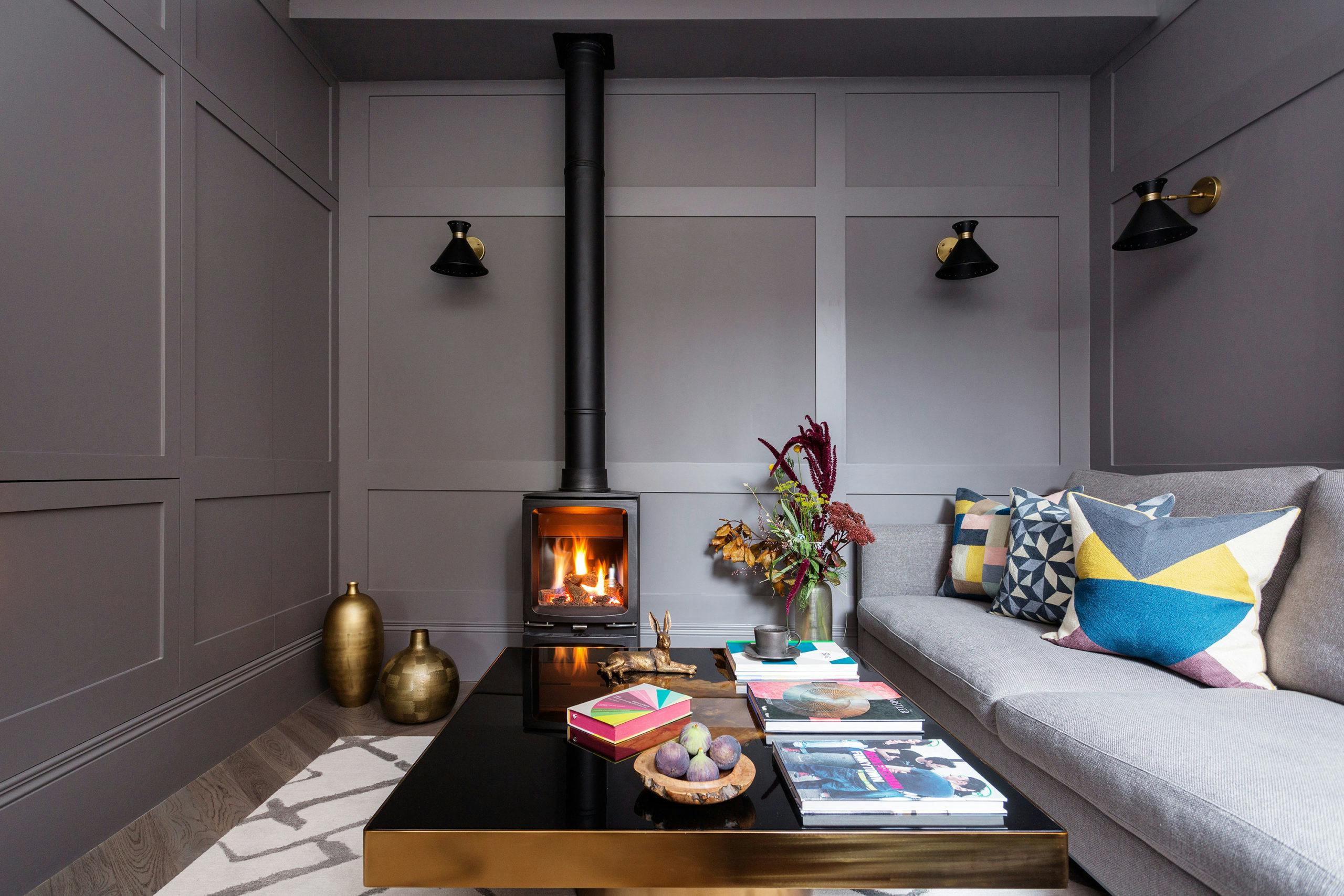 Now a snug, this was the darkest room with the least going for it architecturally. A cool and cosy space was created with elegant wall-panelling, a low corner sofa, stylish wall lamps and a wood-burning stove. It’s now the family’s favourite room, as they gather here for movie nights.