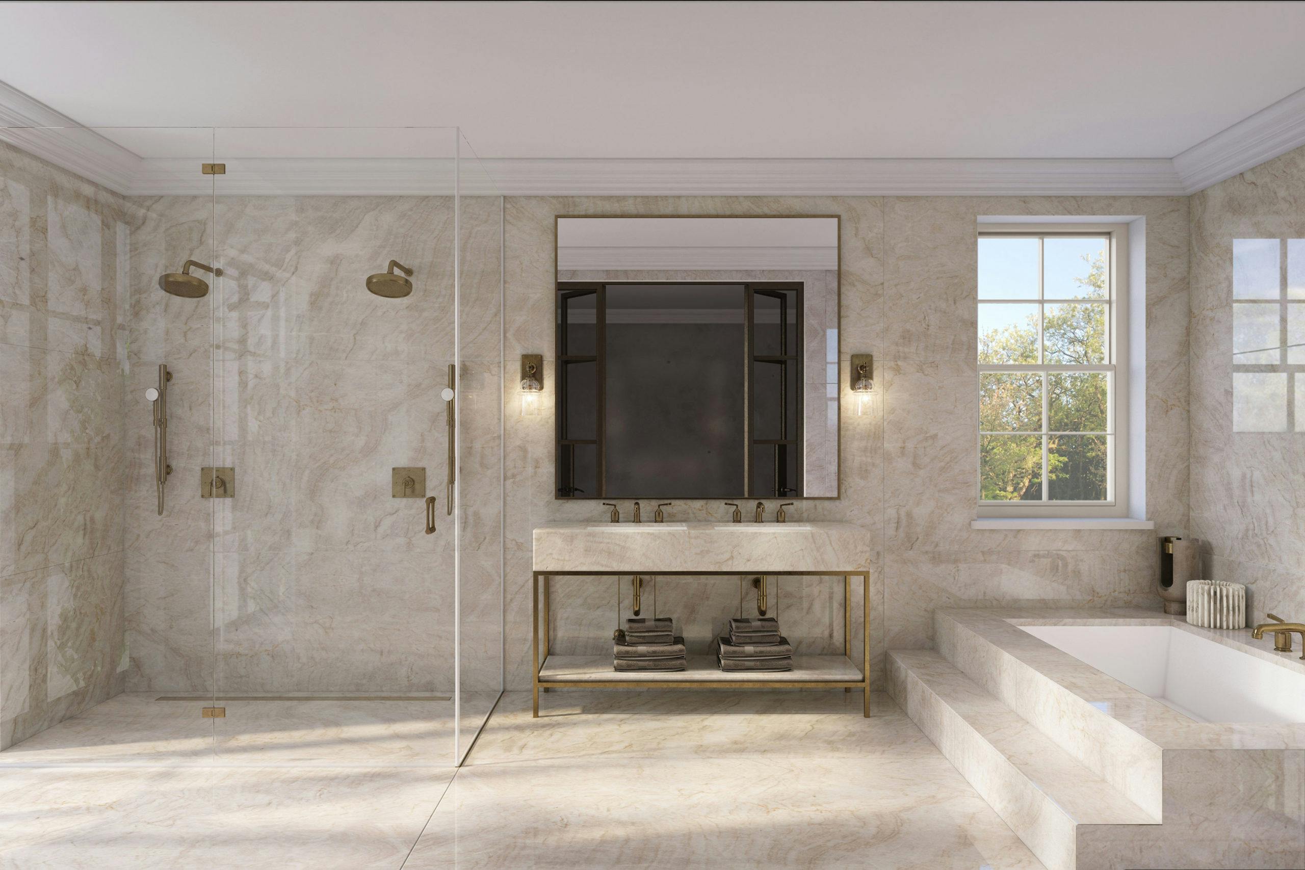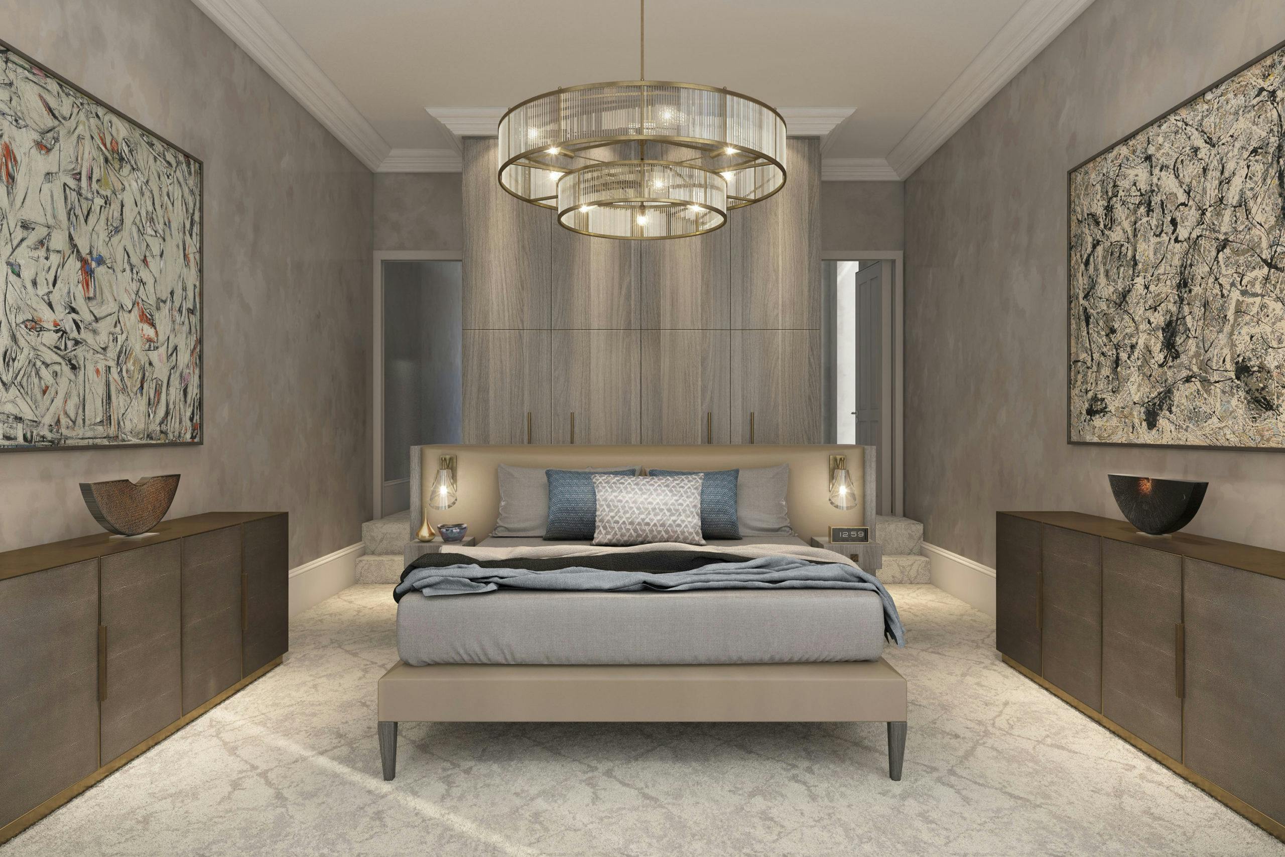 The master bedroom is both serene and sumptuous, incorporating walk-in wardrobes and a dressing area cleverly situated behind a beautiful bespoke leather headboard with floating bedside cabinets. The bed is flanked by two custom-made bronze and shagreen-clad sideboards, while a glamorous brass and glass chandelier and artworks by US artist Mark Bradford invigorate the calm, neutral palette.