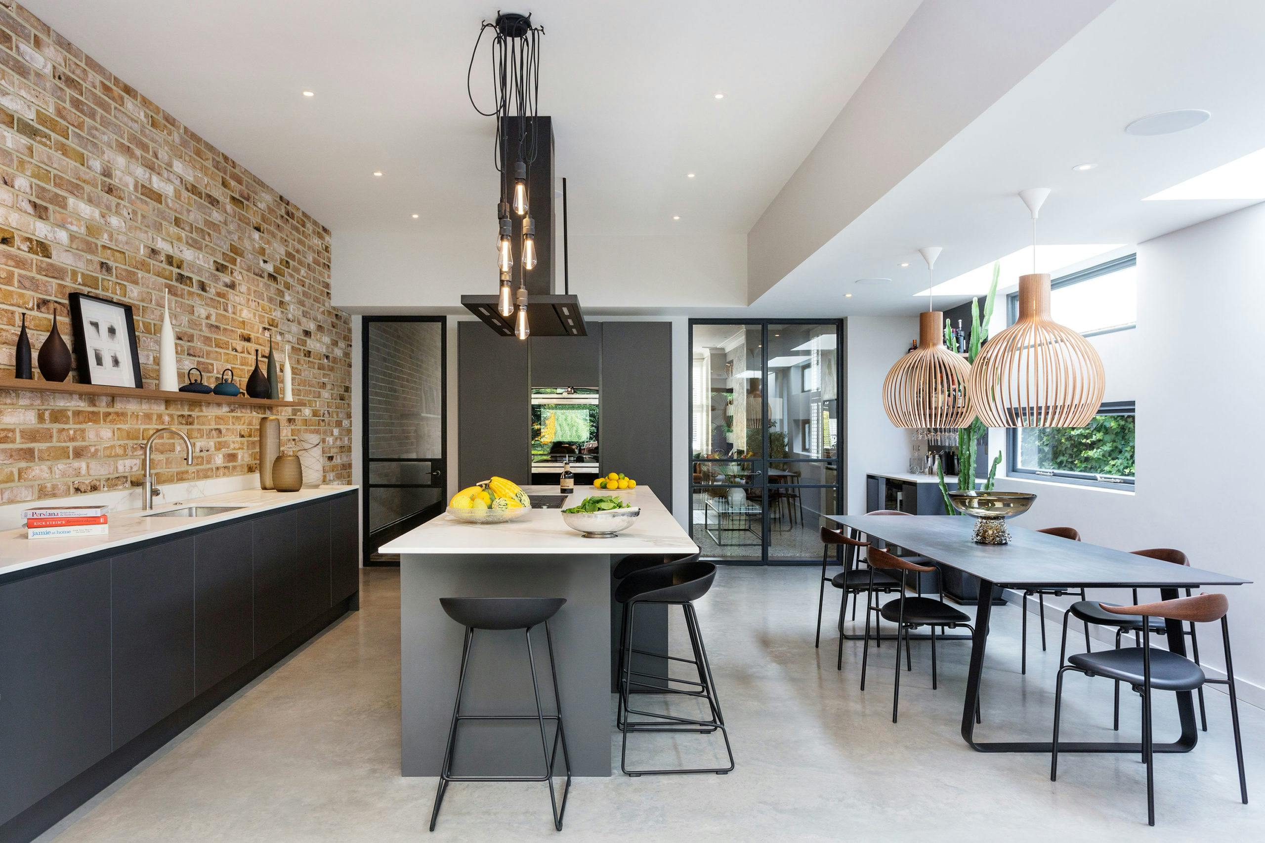 A linear, black lacquered table surrounded by Carl Hansen CH88 chairs defines the dining space, with two huge Secto Octo walnut pendants suspended above; the warm tones of the timber balancing beautifully with the exposed brick opposite