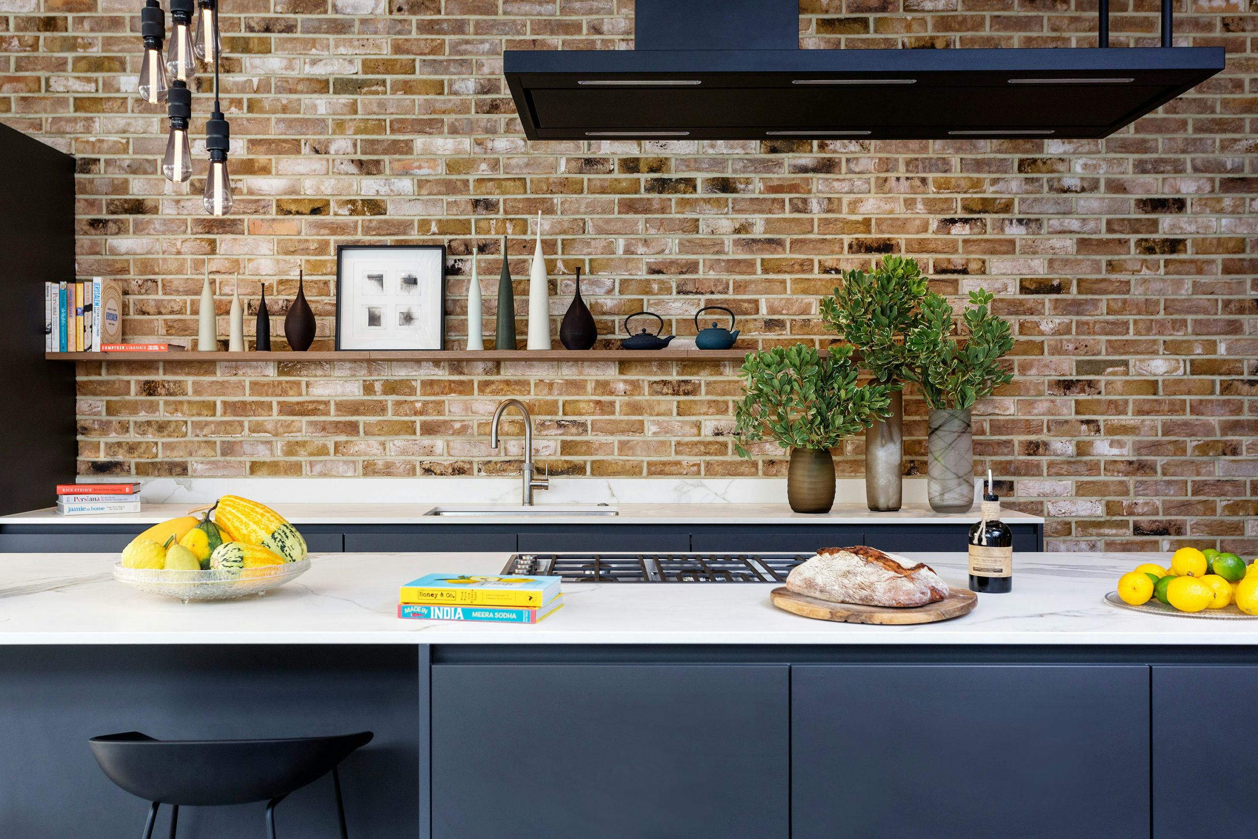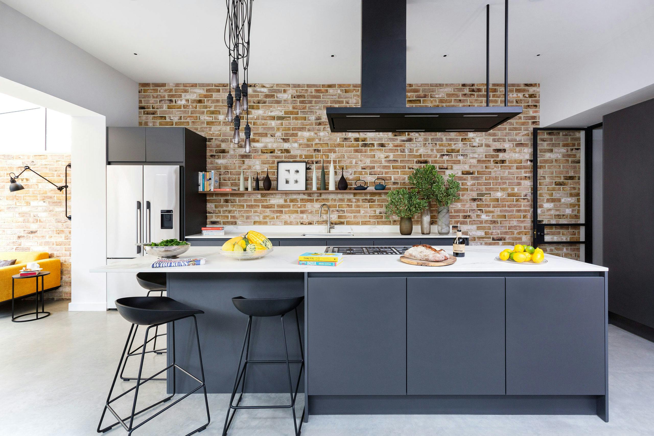 A polished concrete floor, white walls and an exposed brick feature wall combine to create a stylish setting for the sleek matt charcoal kitchen cabinets, which are topped with white marble worktops.
