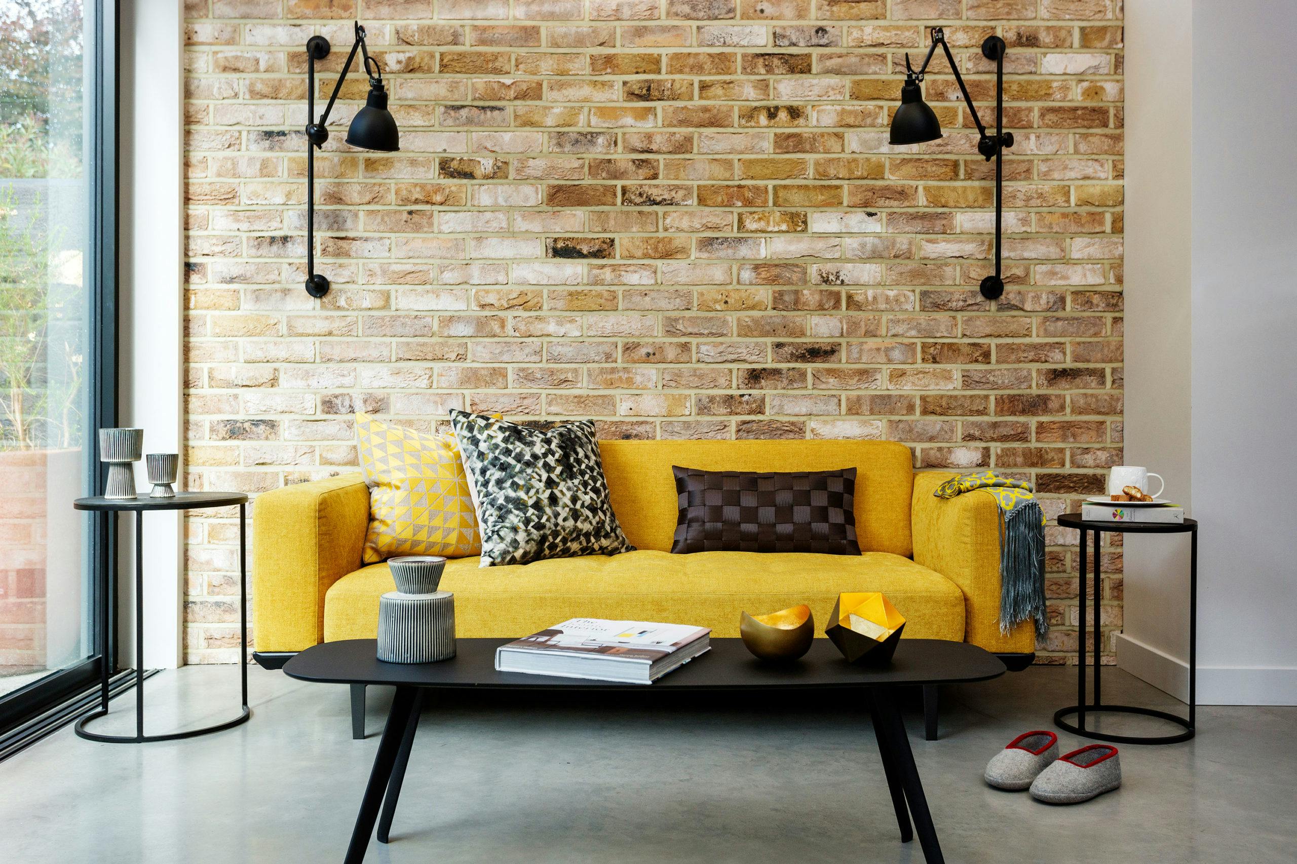 The exposed brick wall continues in the lounge area linking the two rooms. A chic mustard-coloured sofa and simple, black-framed furniture and lighting create a cosy and cohesive scheme. The result is a contemporary yet relaxed entertaining space.