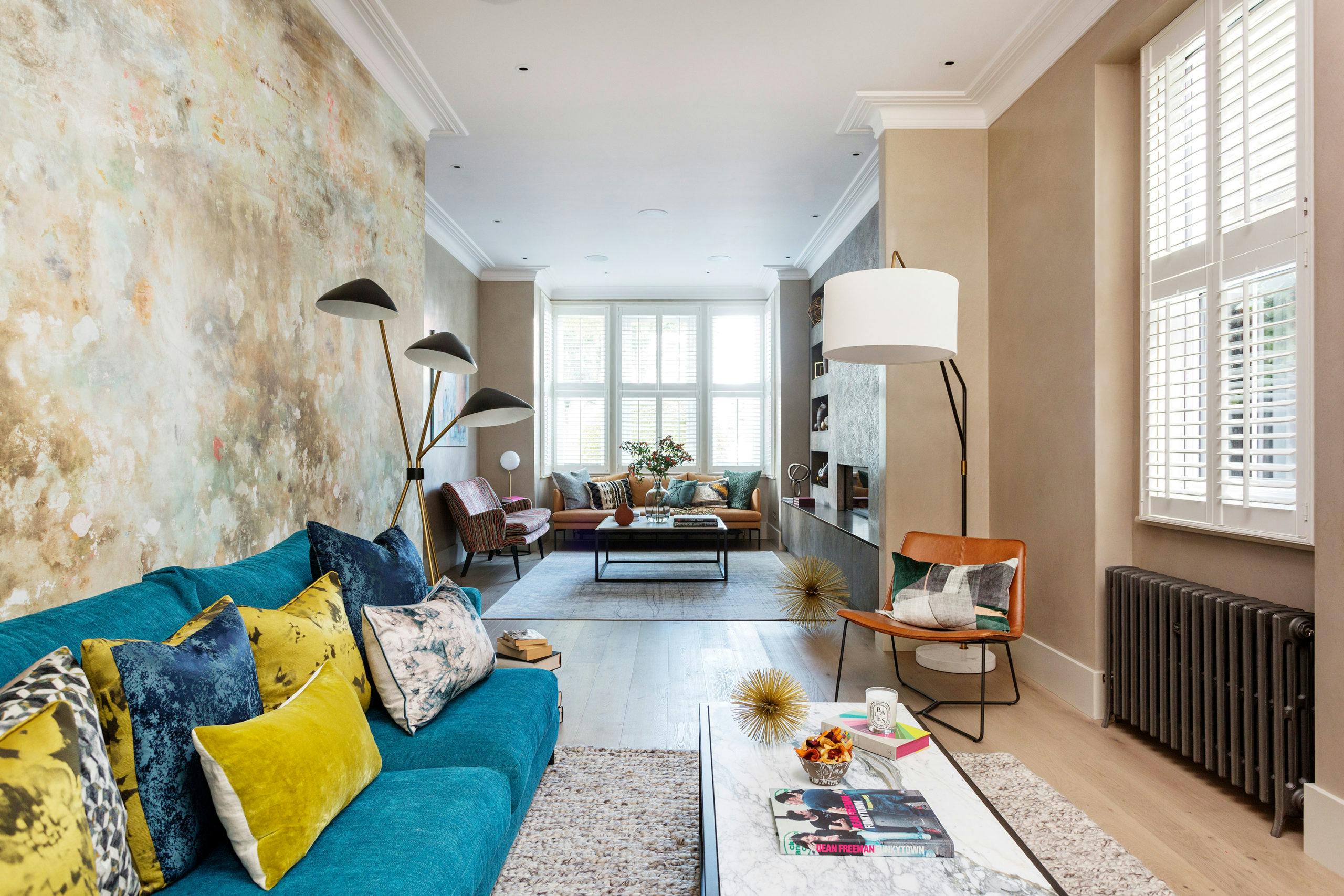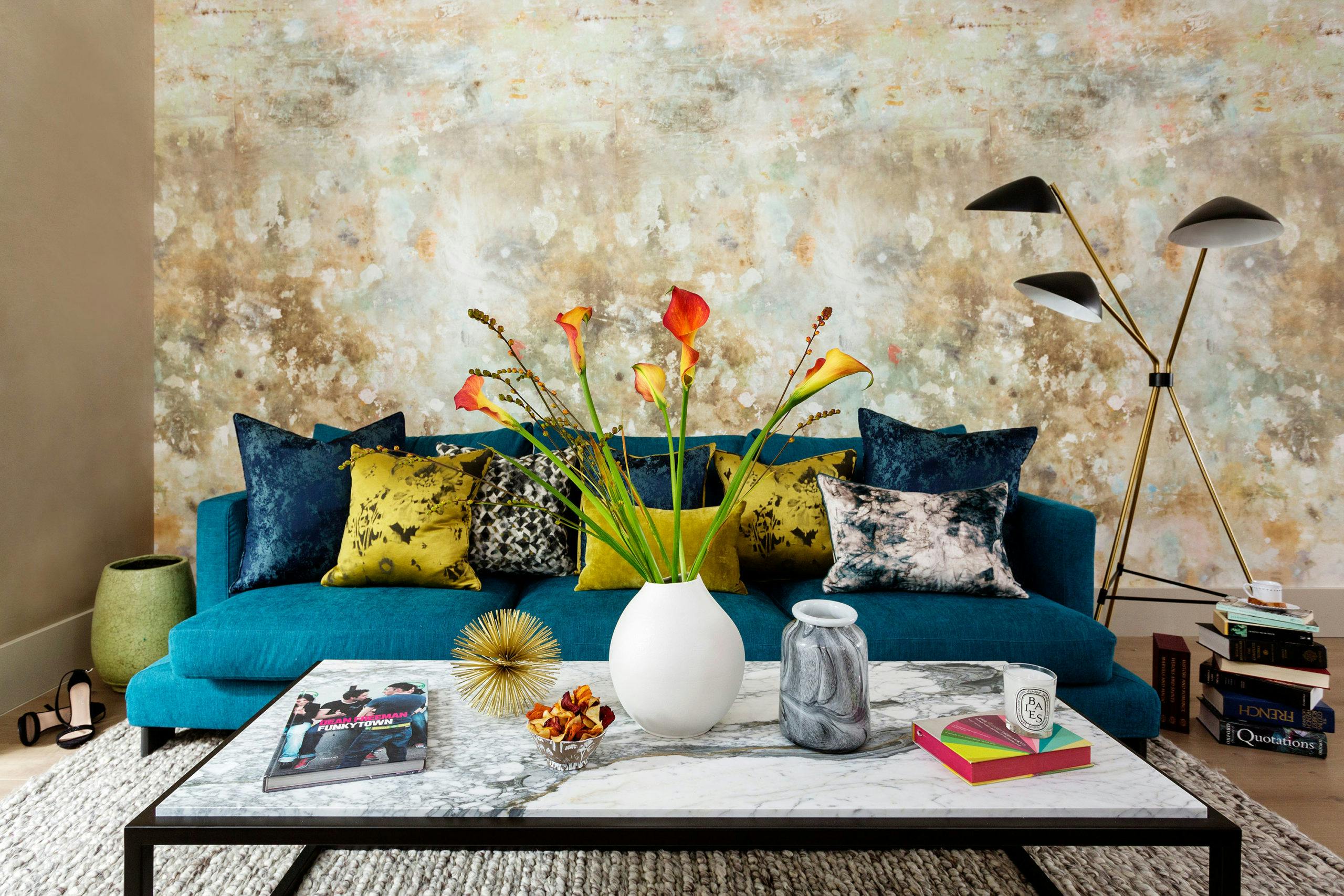 Colourful, contemporary furniture, stylish lighting and interesting art, accessories and objet complement the eye-catching backdrop.