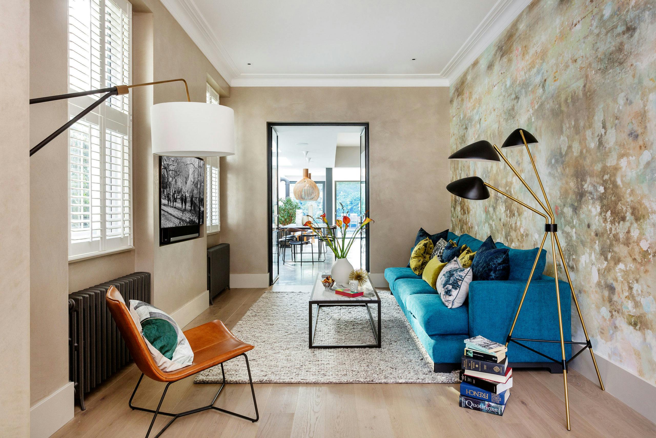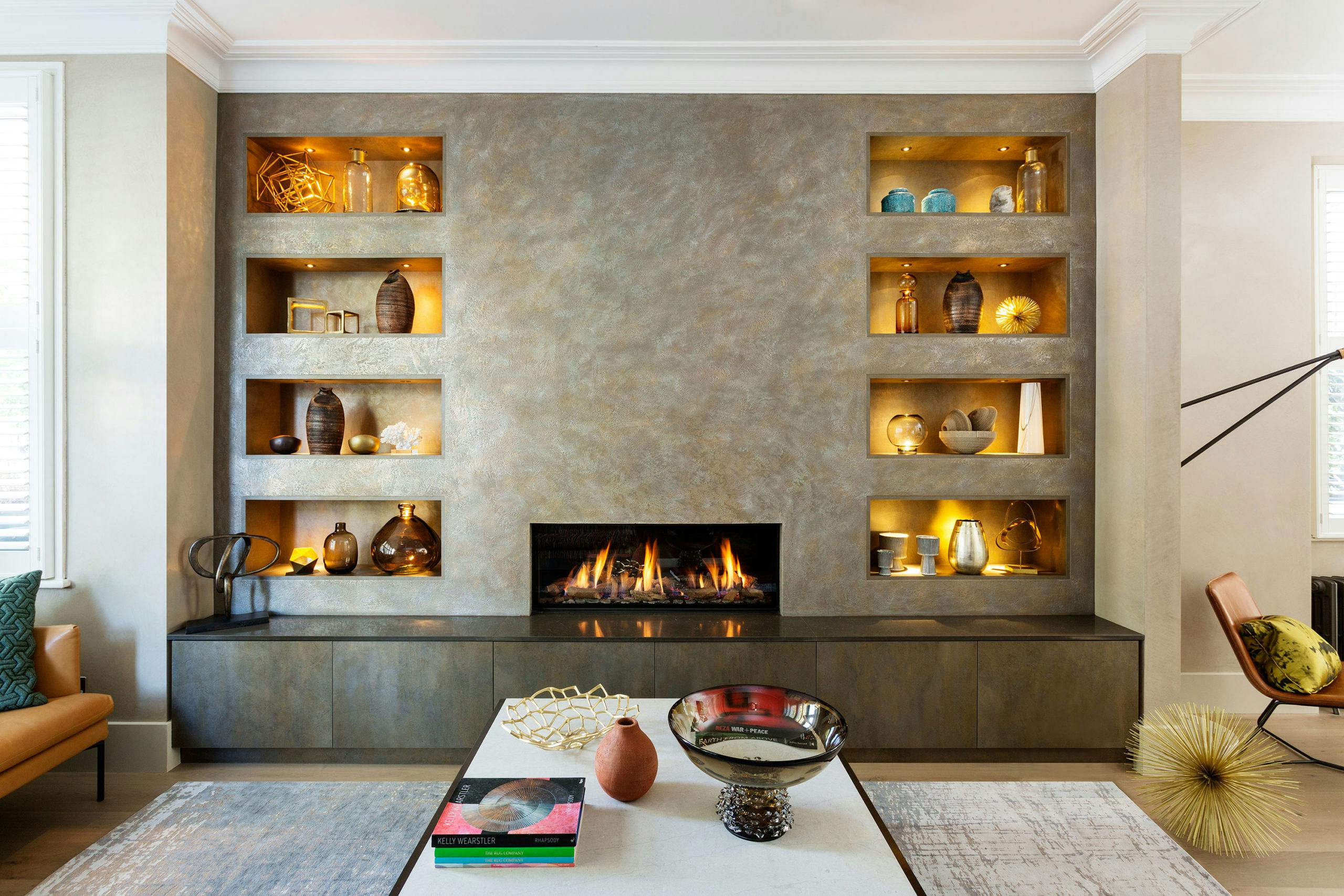This sophisticated room at the front of the property leads through to a relaxed TV area and a beautiful kitchen-diner beyond. A stunning butterscotch polished plaster wall with an inset fireplace, symmetrical backlit shelves and dropped down low cabinetry designed by HUX London sets a striking tone.