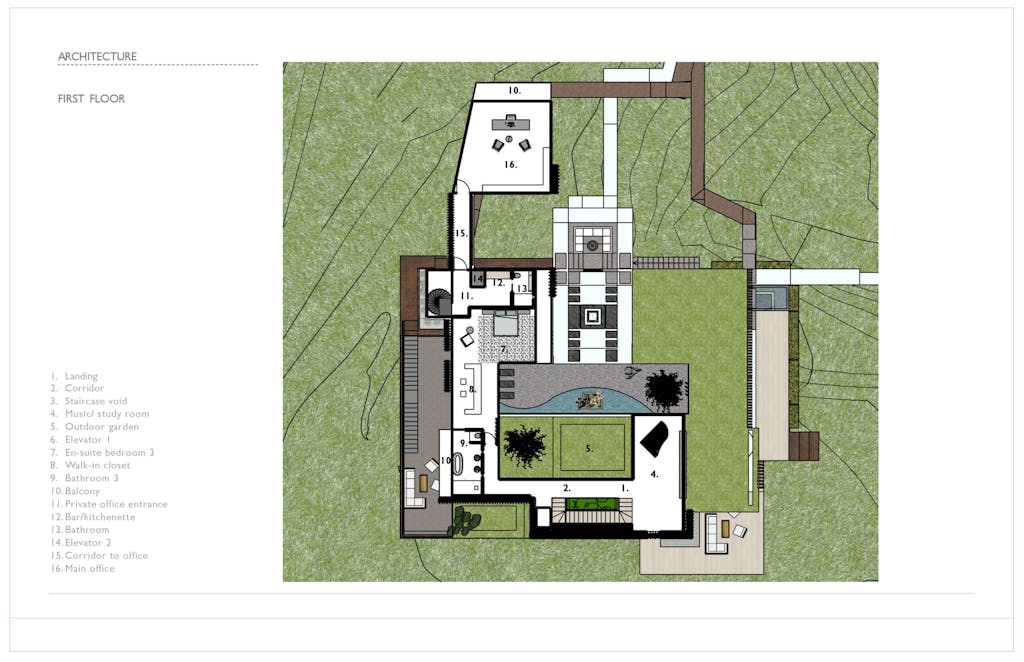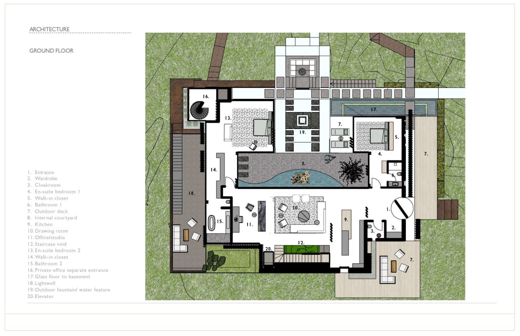 The central courtyard comprises water features, sculptures, and mature planting, to emphasise the inside out connection with nature.