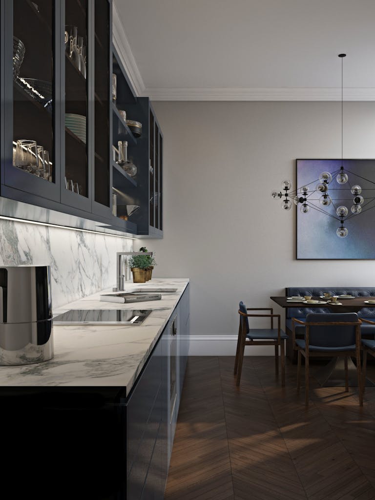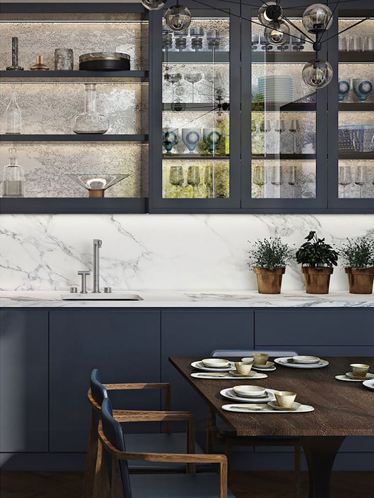 Smart, deep-navy Shaker-style cabinetry lines an entire wall and is contrasted with exquisite antique mirrored back panels and beautiful Carrara marble surfaces in the kitchen. Rich walnut chevron flooring brings warmth to the room