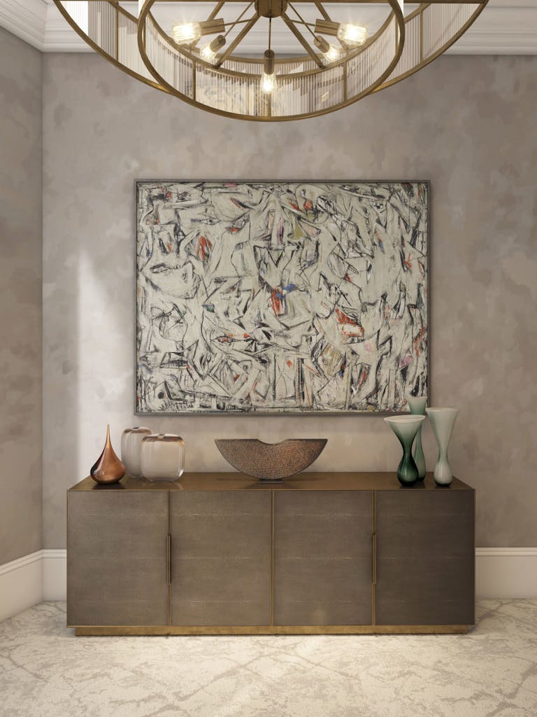 The master bedroom is both serene and sumptuous, incorporating walk-in wardrobes and a dressing area cleverly situated behind a beautiful bespoke leather headboard with floating bedside cabinets. The bed is flanked by two custom-made bronze and shagreen-clad sideboards, while a glamorous brass and glass chandelier and artworks by US artist Mark Bradford invigorate the calm, neutral palette.
