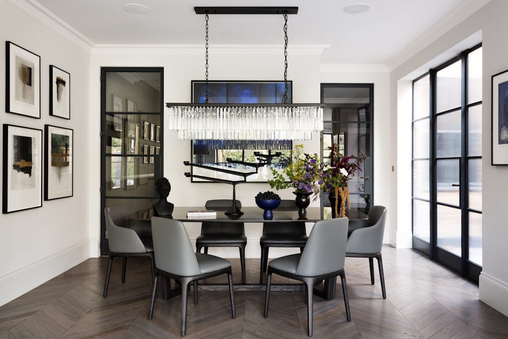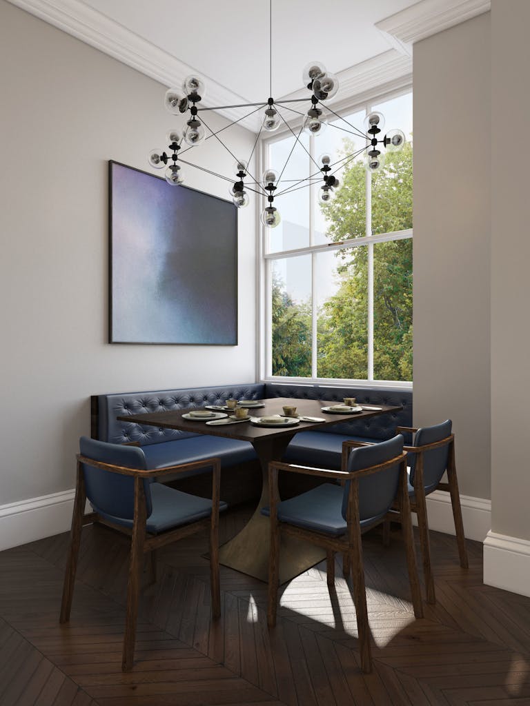 The dining area is zoned with navy buttoned leather banquettes, a bespoke sculptural bronze table and chairs Piero Lissoni by Lema. A contemporary chandelier by Roll & Hill, and artwork by an up and coming contemporary artist, complete this sophisticated scheme.