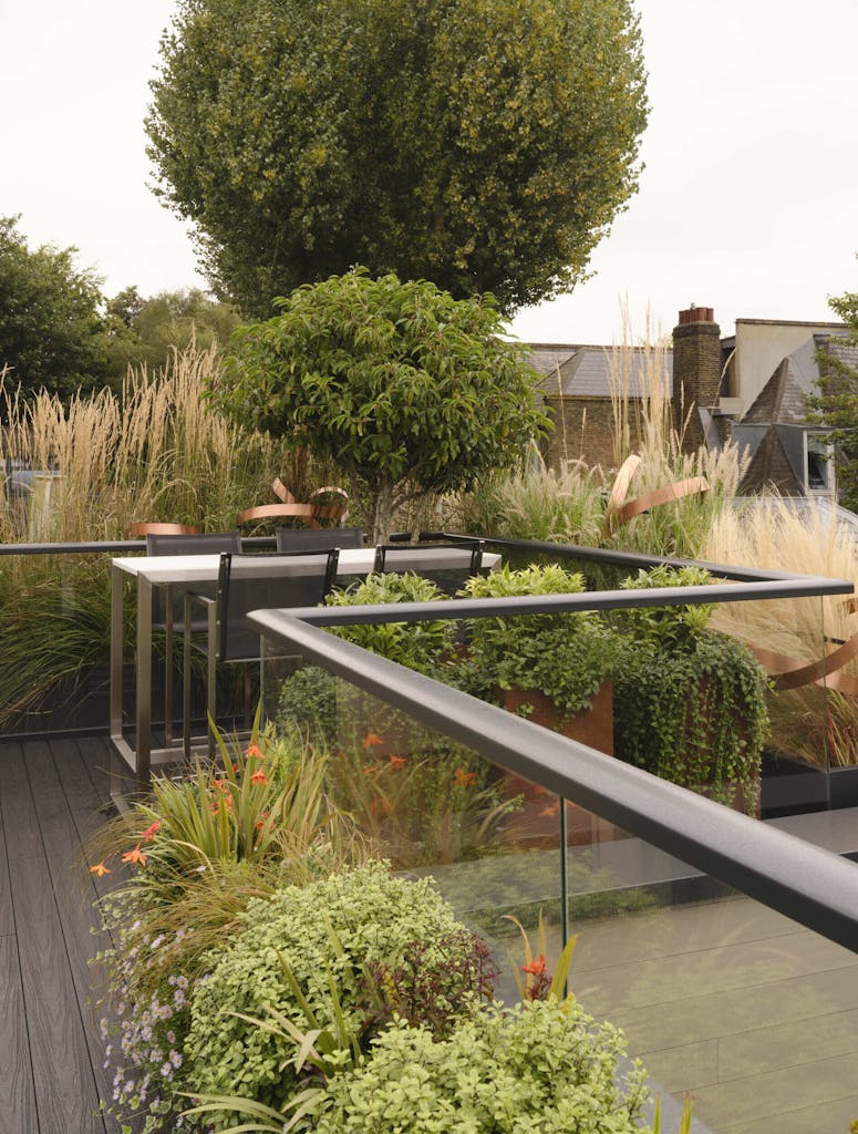 The dining room has a slightly lower ceiling, and the obvious direction would be to keep it light and bright, however we took a more dynamic approach, wrapping the walls and ceiling in rust-coloured Corten steel to create an enveloping space that balances with the larger expanse of glass at the windows.