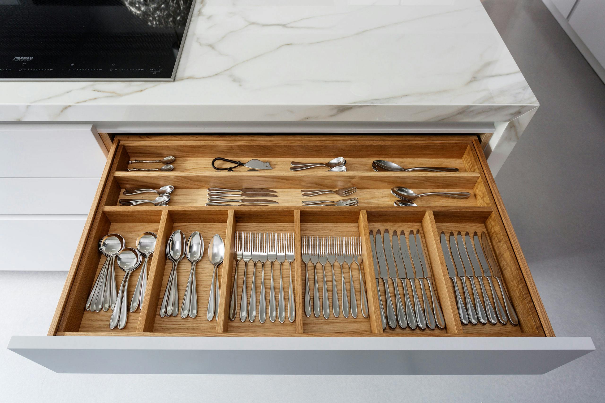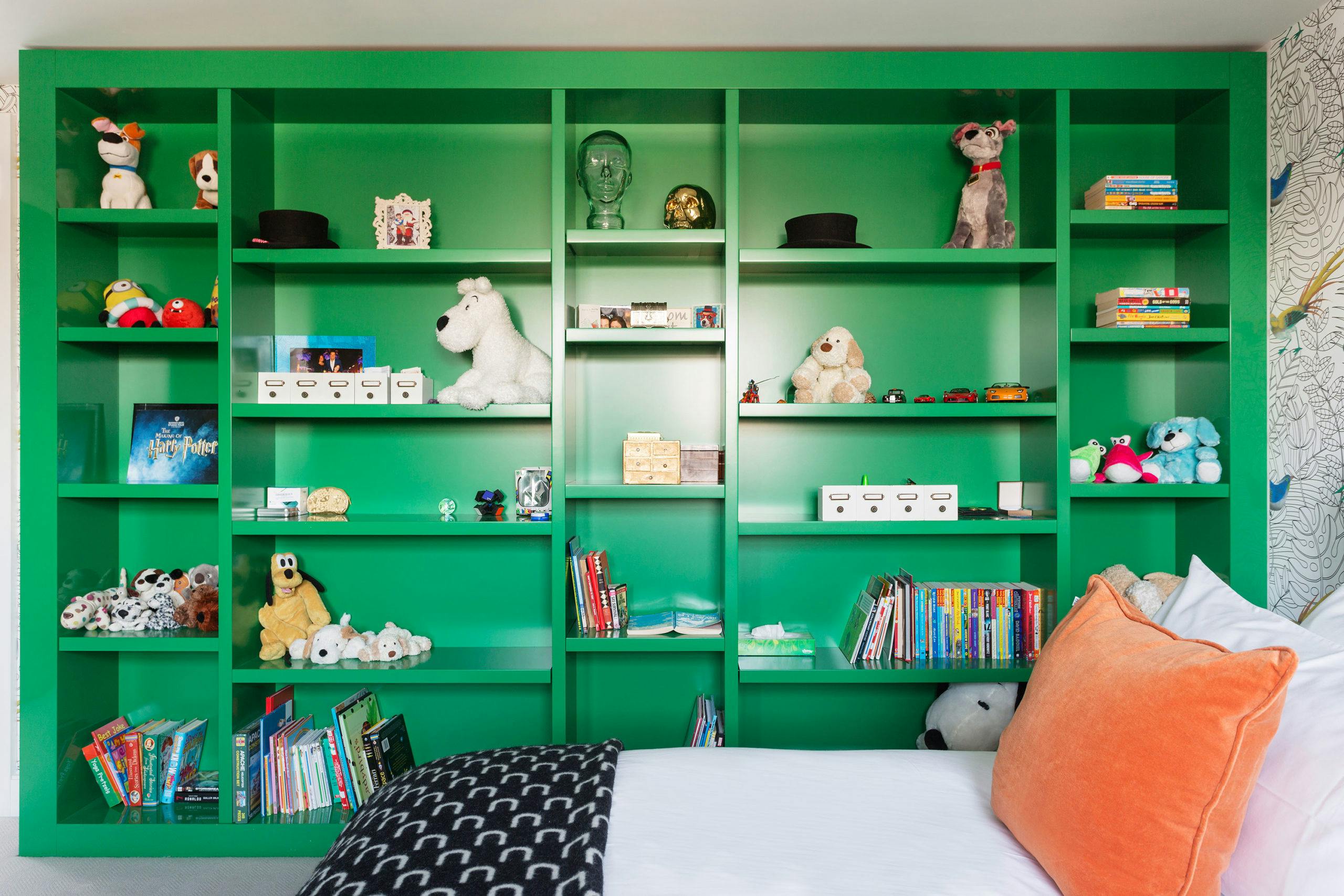 The sleek white kitchen features an enormous porcelain Statuario marble island with lacquered cabinets, designed in collaboration with kitchen specialists HUX London. This open plan space serves as an informal family dining zone with a beautiful leather banquette in racing car green built into a niche, with concealed children’s work stations either side.