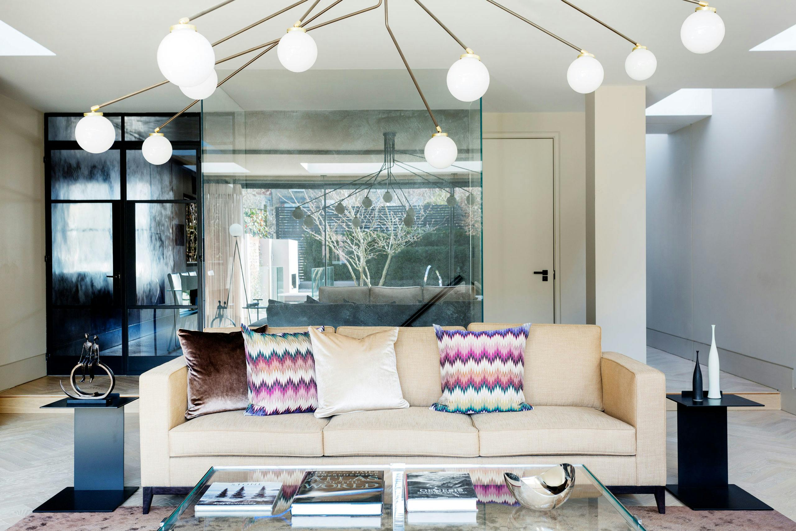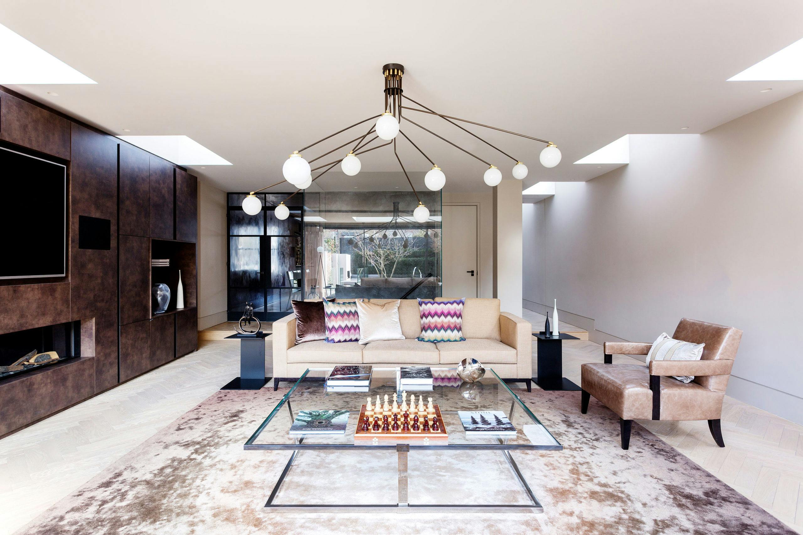 Full height Crittal doors lead through to the enormous sitting room, which overlooks the elegant contemporary garden designed by Ruth Willmott Associates. The central feature here is a 7-metre-long bronze media unit. This bold feature is balanced with pale walls and distressed herringbone taupe timber flooring, topped with a bespoke silk moon rug.