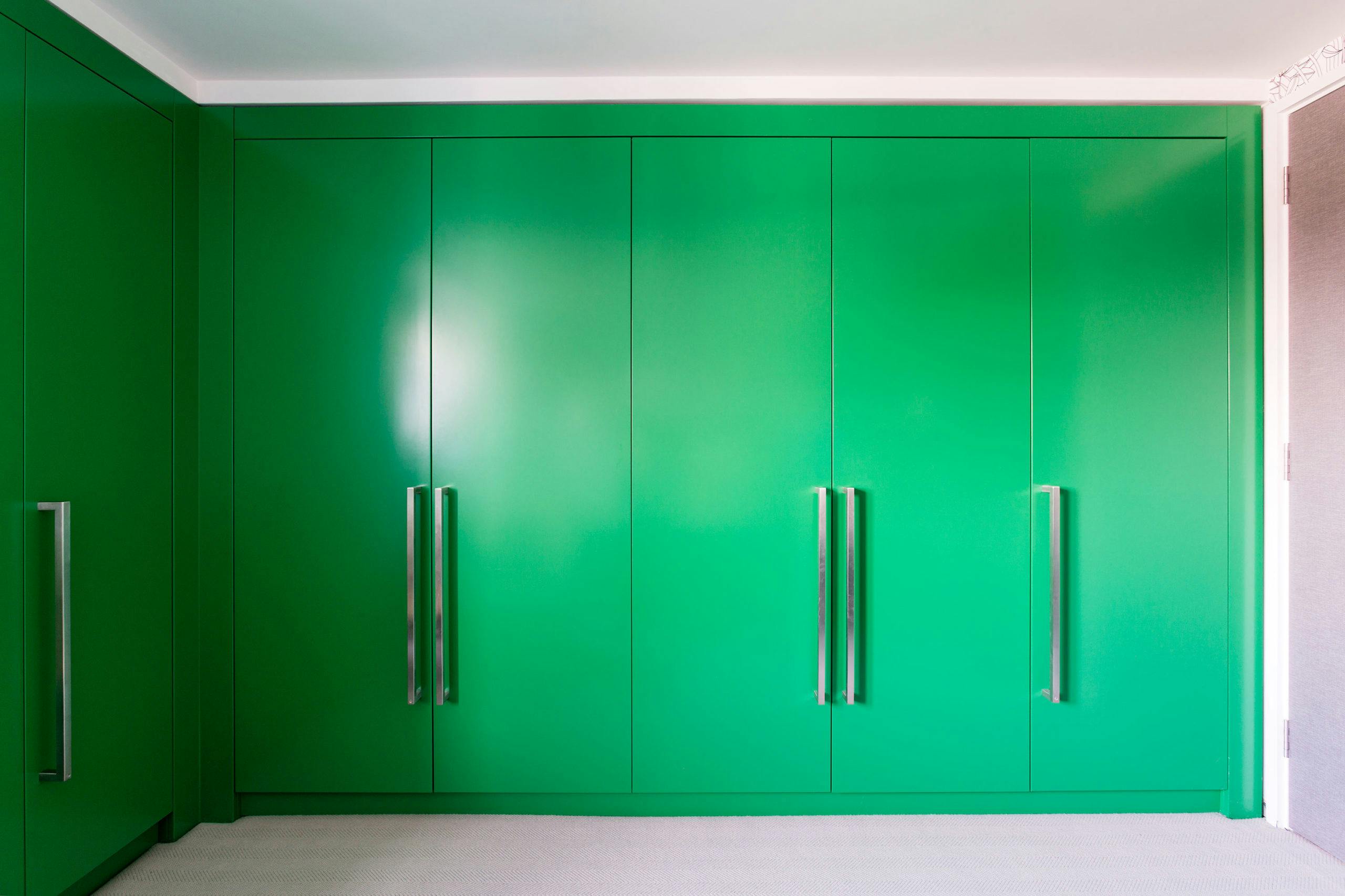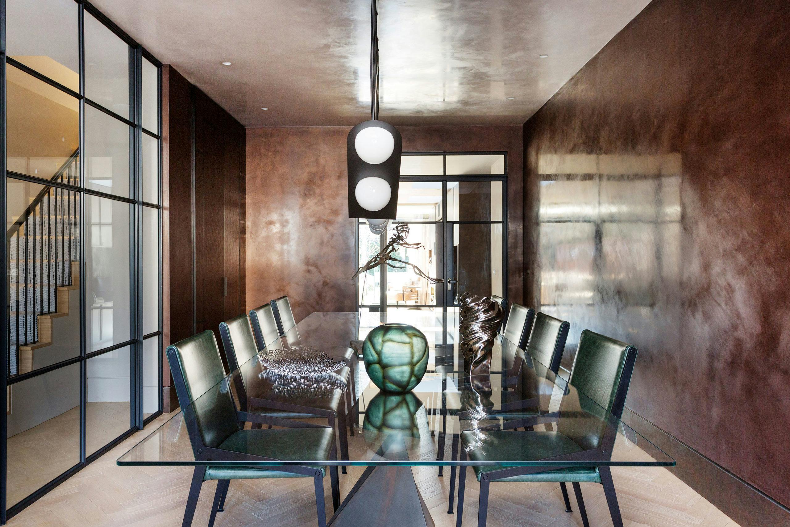 The dining room walls were finished in a specialist bronze rose gold grassello plaster, bringing a sumptuous texture to the space, while the ceiling is wrapped in a contrasting polished plaster finish. Furniture was kept to a minimum with a long glass dining table and contemporary dining chairs made from patinated steel and upholstered in green leather. Suspended above the dining table is a sculptural lighting feature, with a series of opaque globes and geometric metal forms confidently inhabiting the space.
