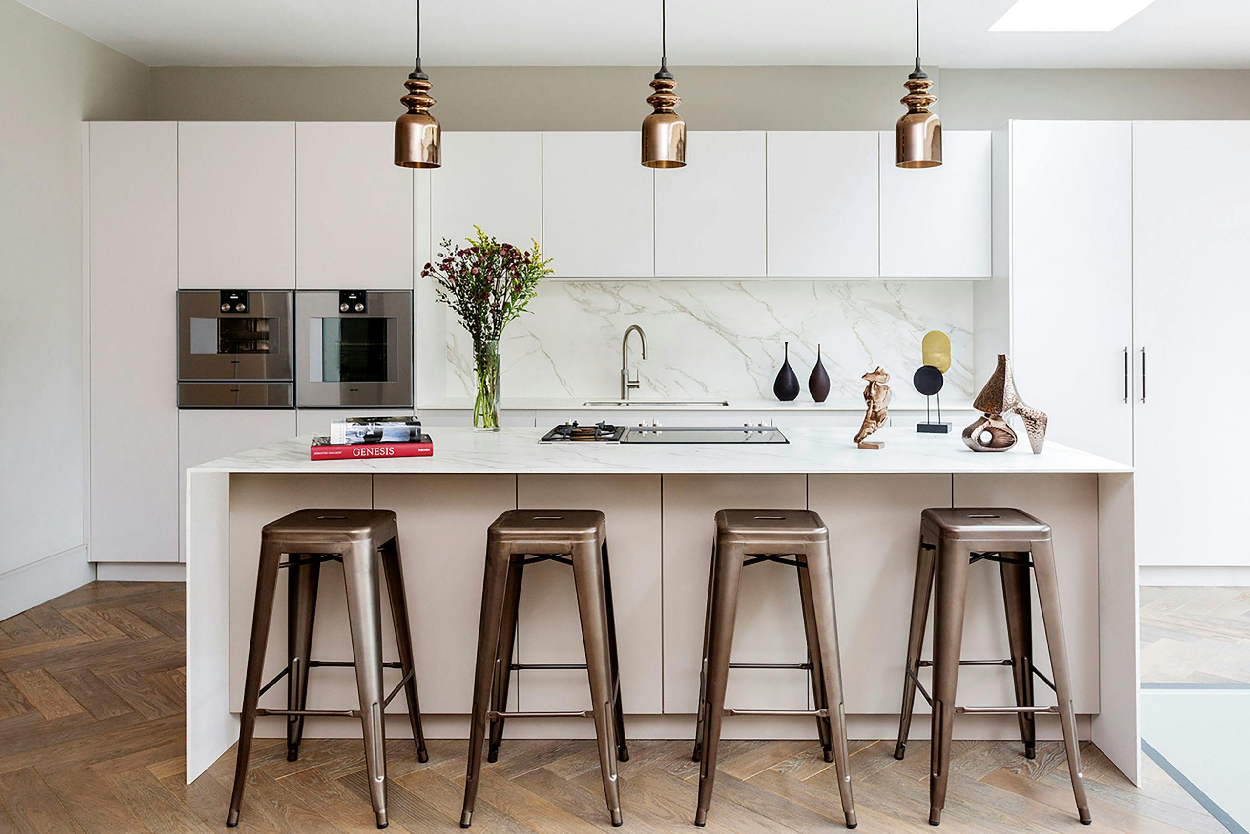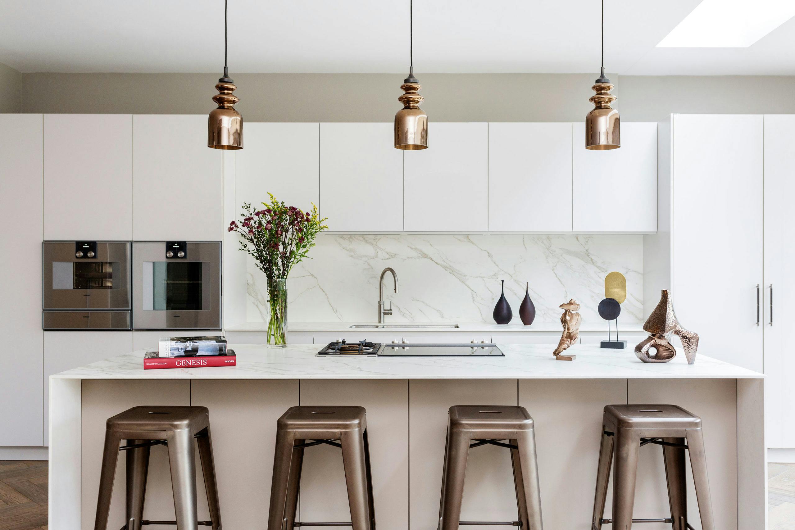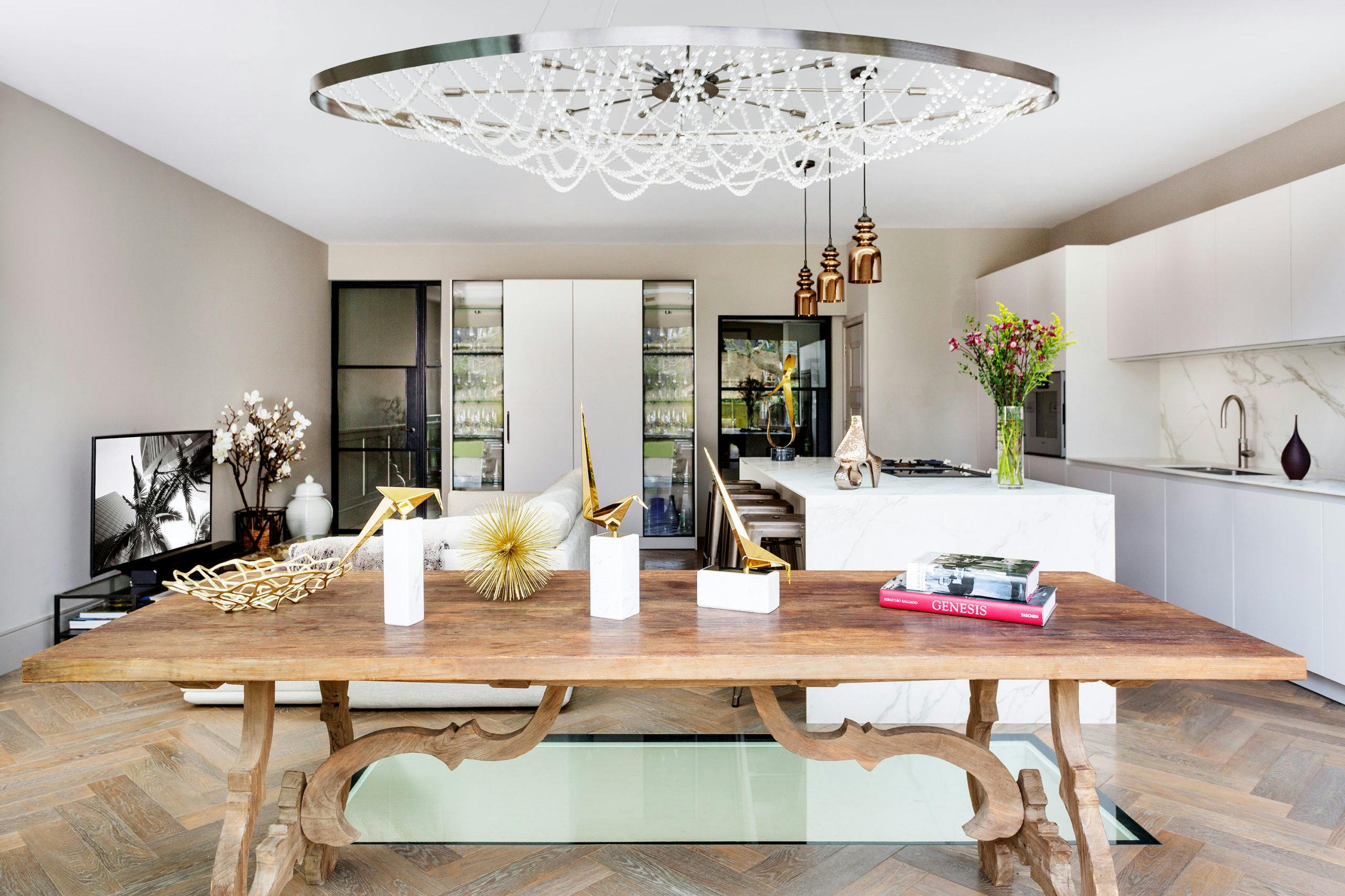 The full-width kitchen-diner is situated at the back of the house. Now a modern, open-plan interior, it includes an informal snug area, dining room and kitchen work area arranged around a marble wraparound island.
