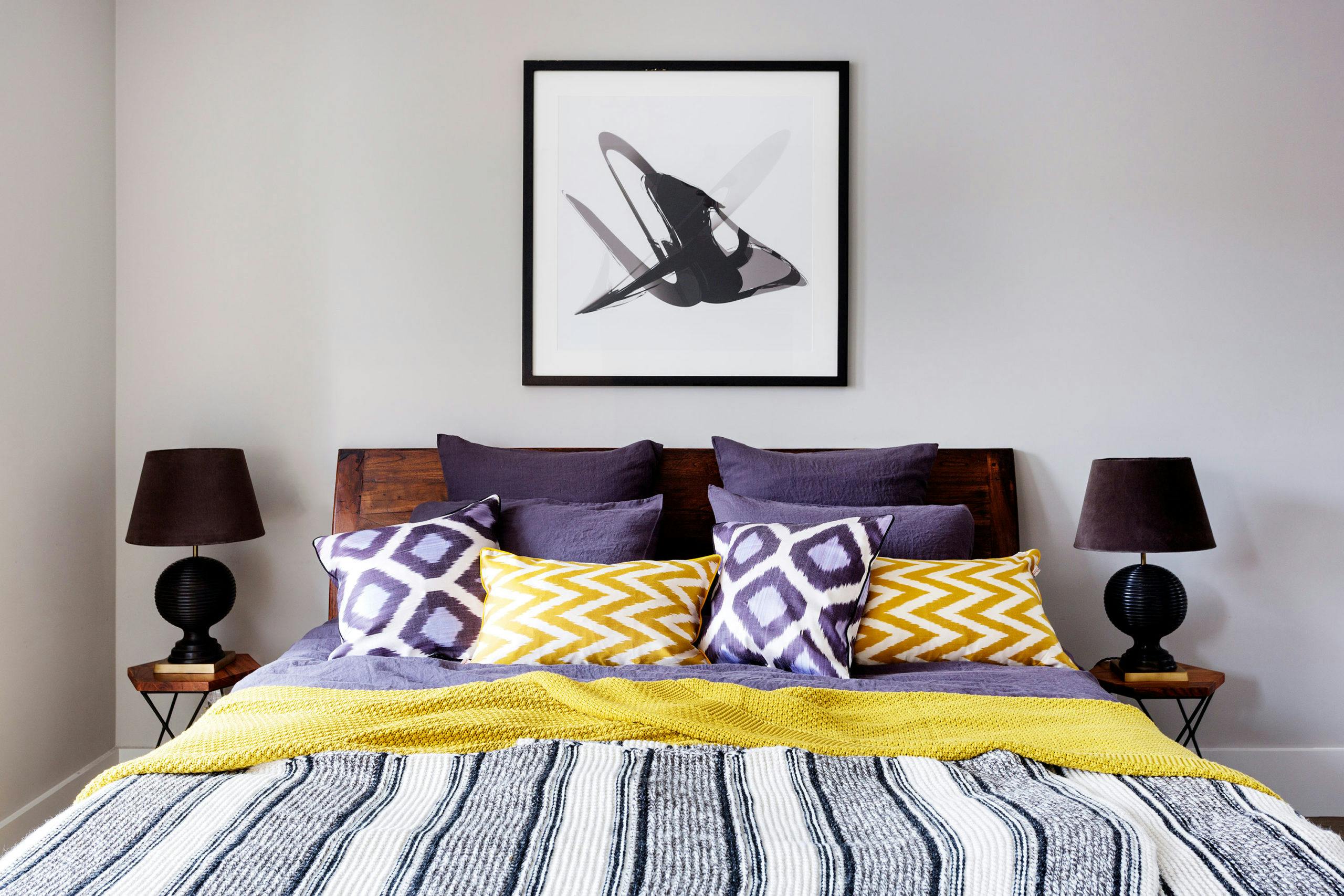 On the first floor, in the master bedroom polished plaster and French grey painted walls teamed with rich timber flooring and furniture provide a soothing ambience that is invigorated with interesting artworks and colourful accessories.