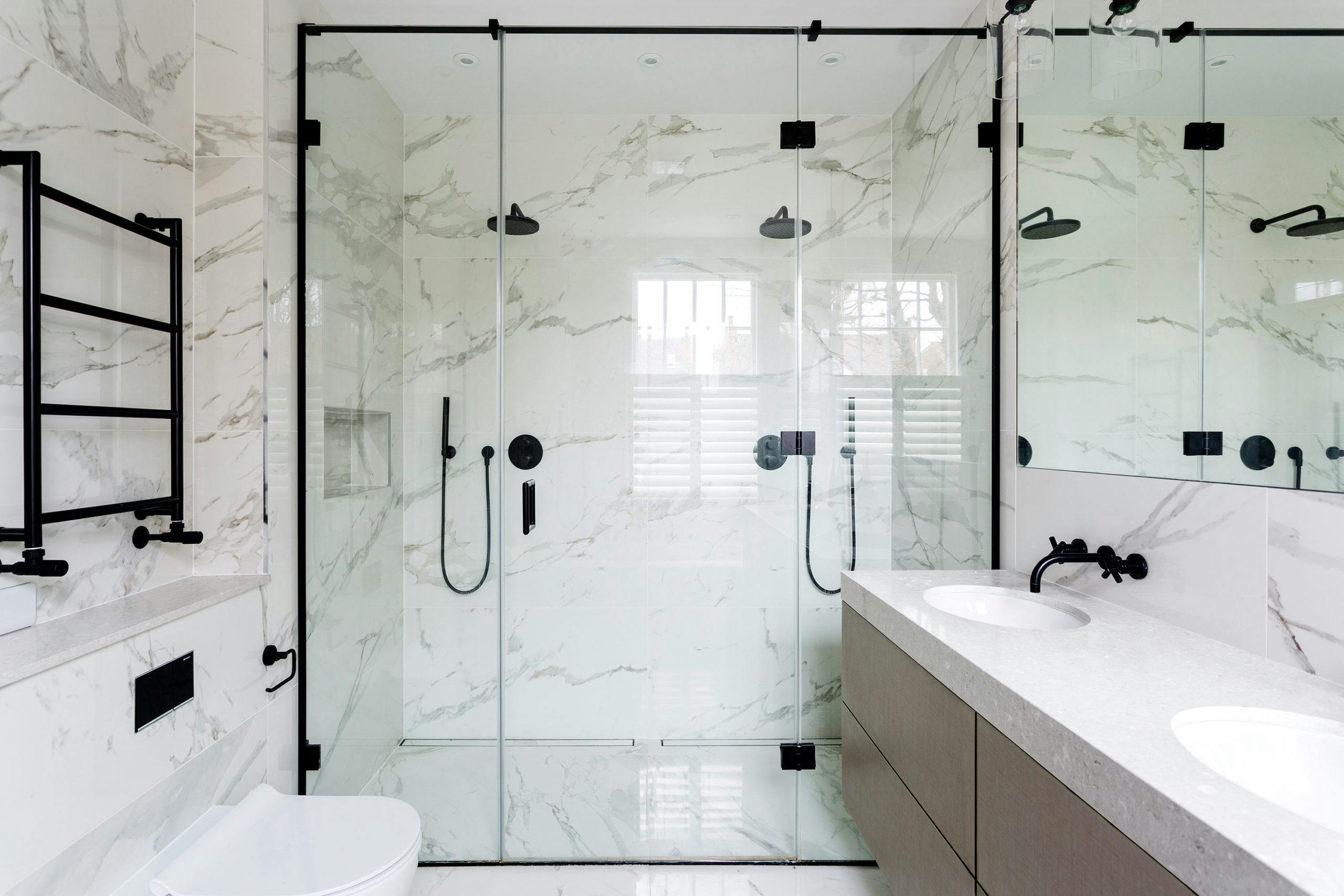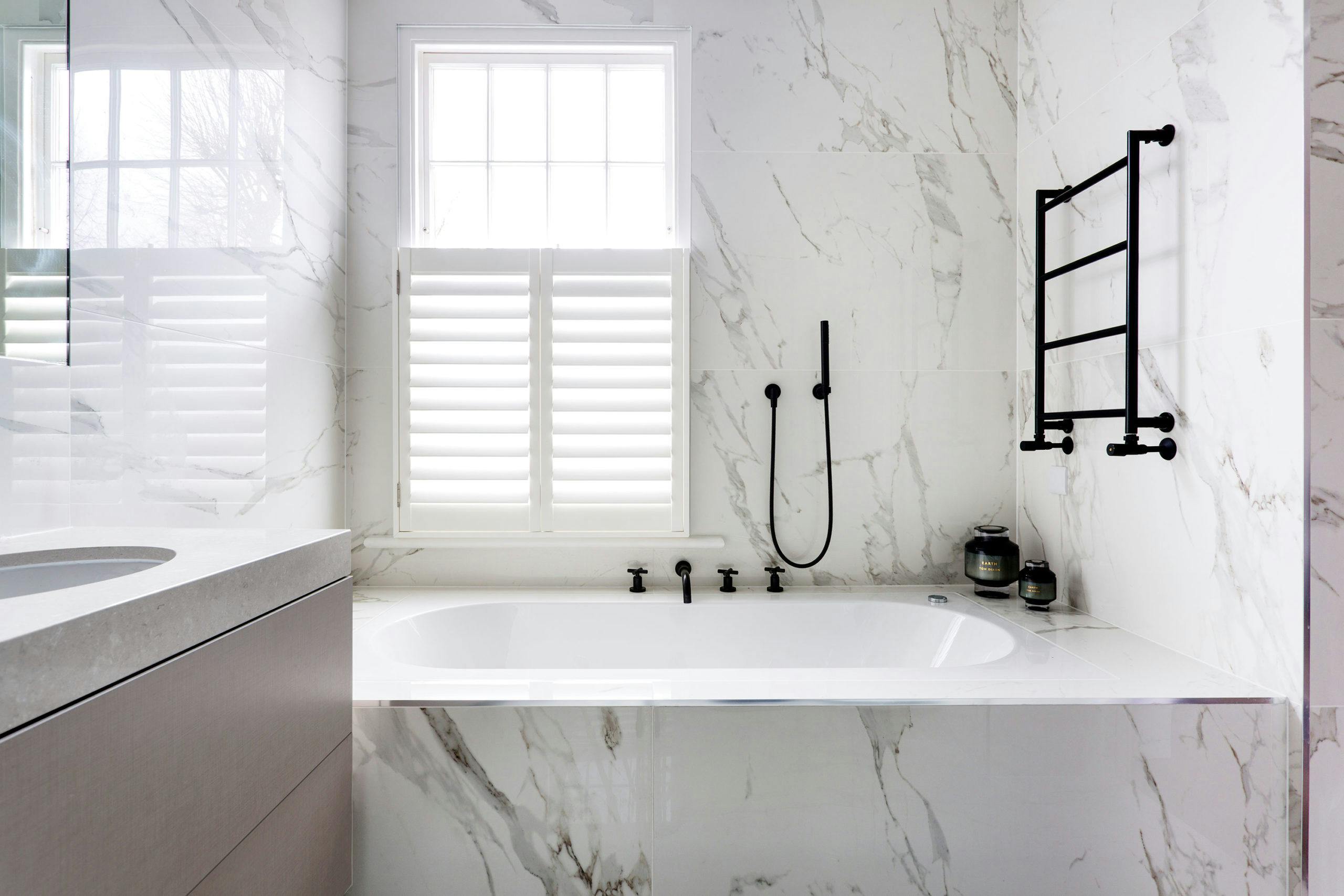 With luxe spa appeal, the Carrara marble-clad master en-suite is offset with graphic black metal hardware and features a double walk-in shower, bespoke twin vanity unit and whirlpool jet bath.