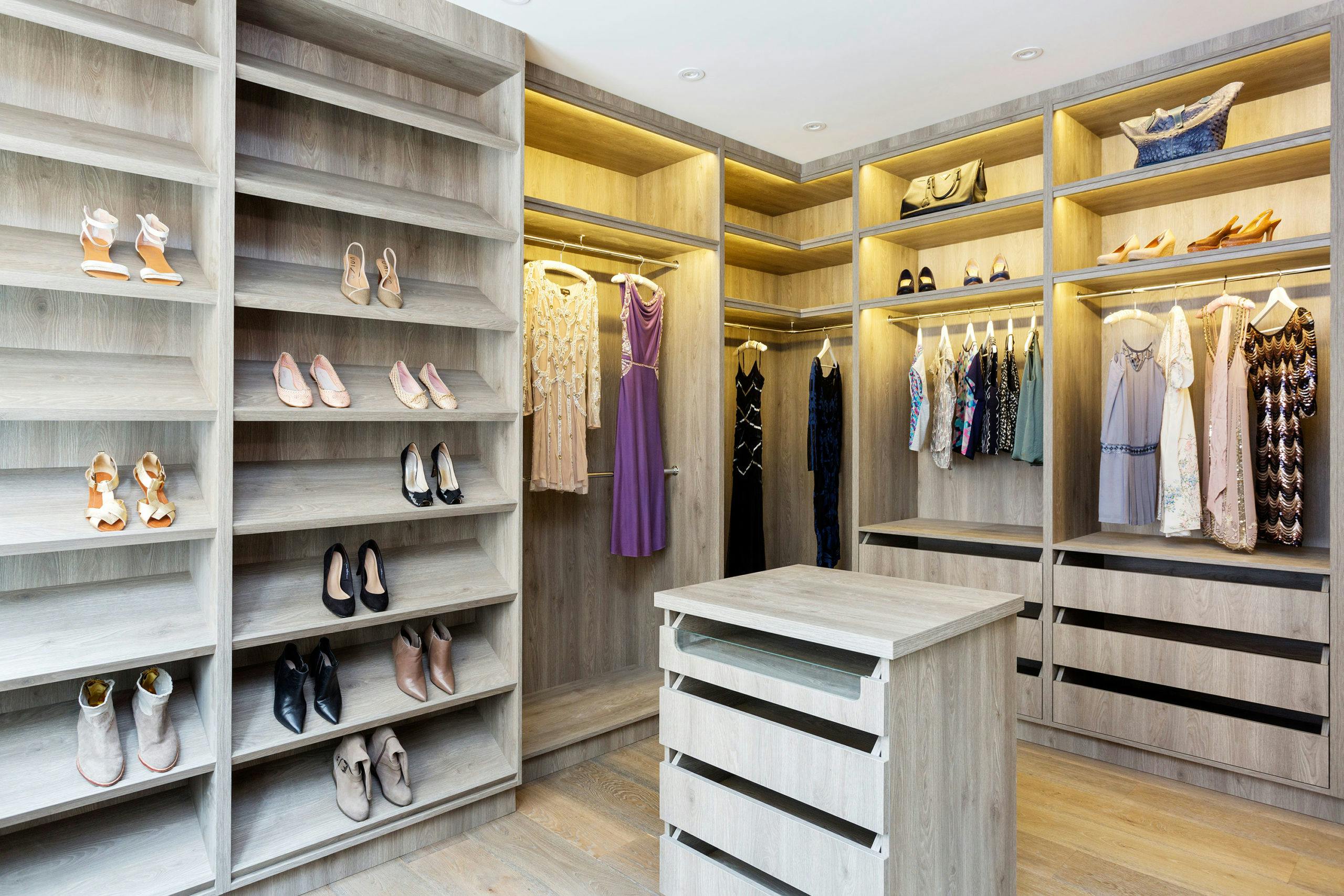 A walk-in dressing room designed by HUX London provides an inordinate amount of storage space for its fashion-loving owner, with metres of well-lit shelving, rails and drawers for clothes, shoes and accessories – and in the centre a generous jewellery island.