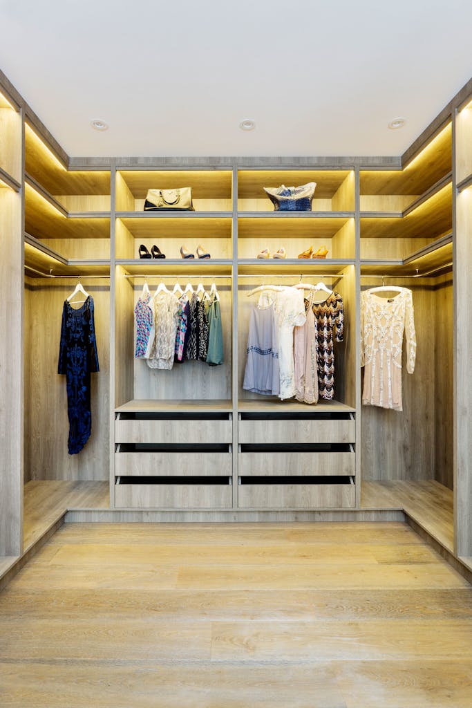 A walk-in dressing room designed by HUX London provides an inordinate amount of storage space for its fashion-loving owner, with metres of well-lit shelving, rails and drawers for clothes, shoes and accessories – and in the centre a generous jewellery island.