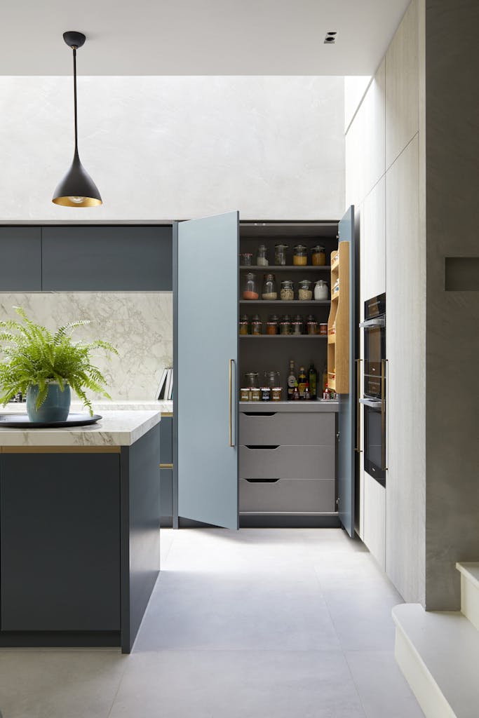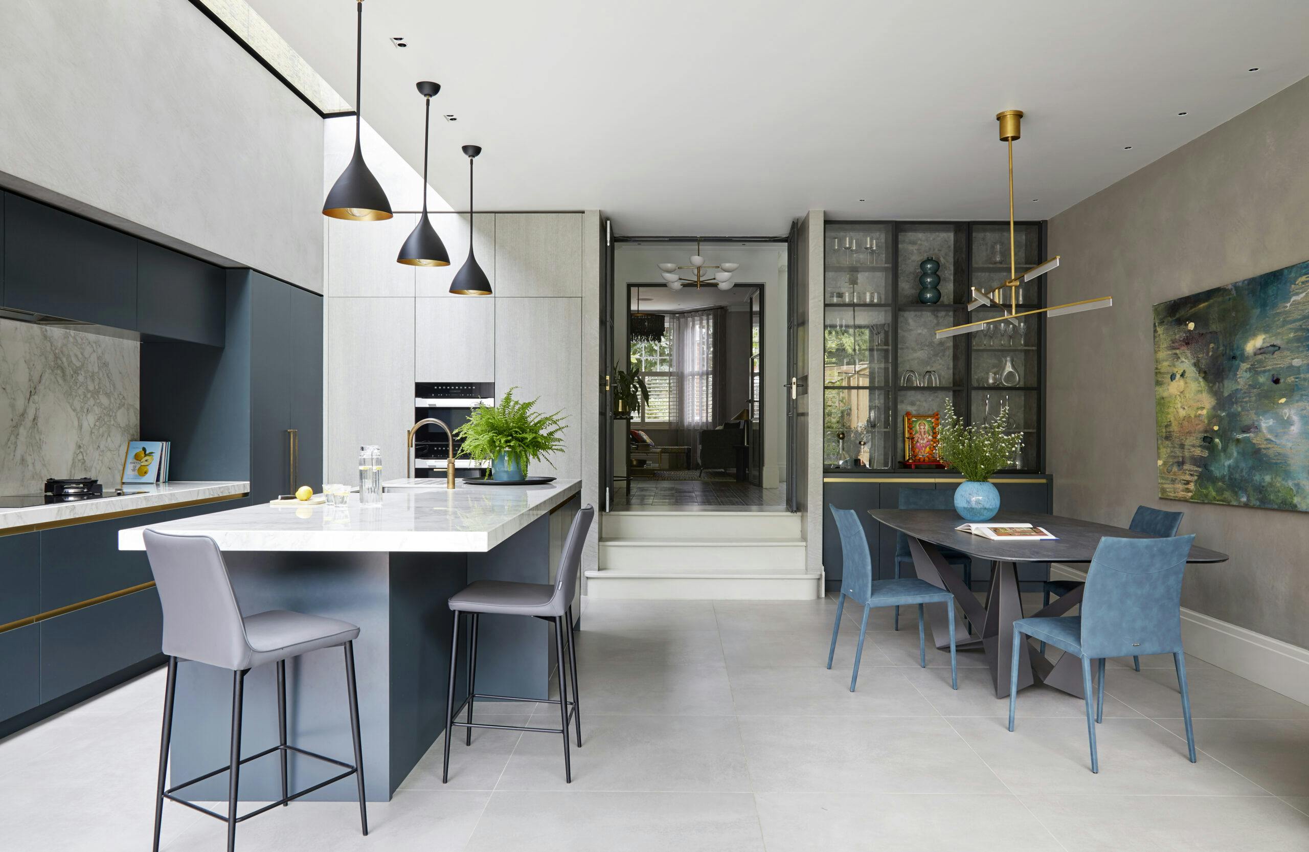 The bespoke kitchen by HUX London features cabinets in a mix of wood veneer and Squid Ink by Paint & Paper Library, with aged brass finger pulls and stunning Dekton worktops. A display dresser and large format Domus floor tiles complete the look.
