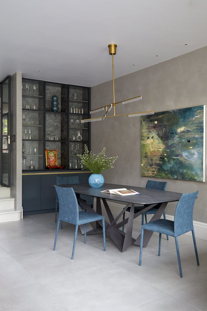 Over the dining table and complimenting the scheme, hangs a painting by Lucie Winterson ‘Stone In Water’ from Aleph Contemporary.