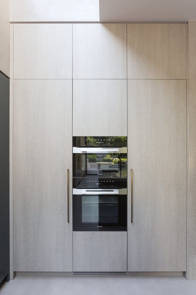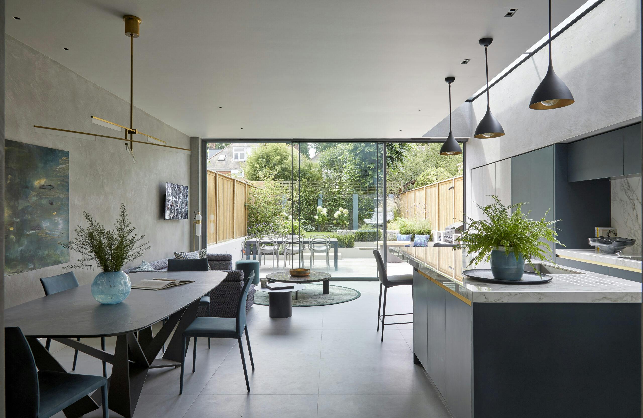 Planning constraints meant we had to work with restricted height to the boundary for the ground floor extension. We dug down to create extra ceiling height, locating the kitchen under the new extension and disguised the restricted height internally with a polished plaster wall above the kitchen units.