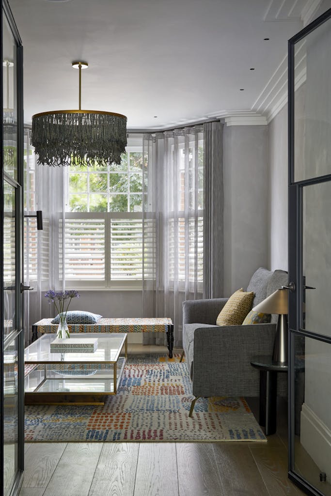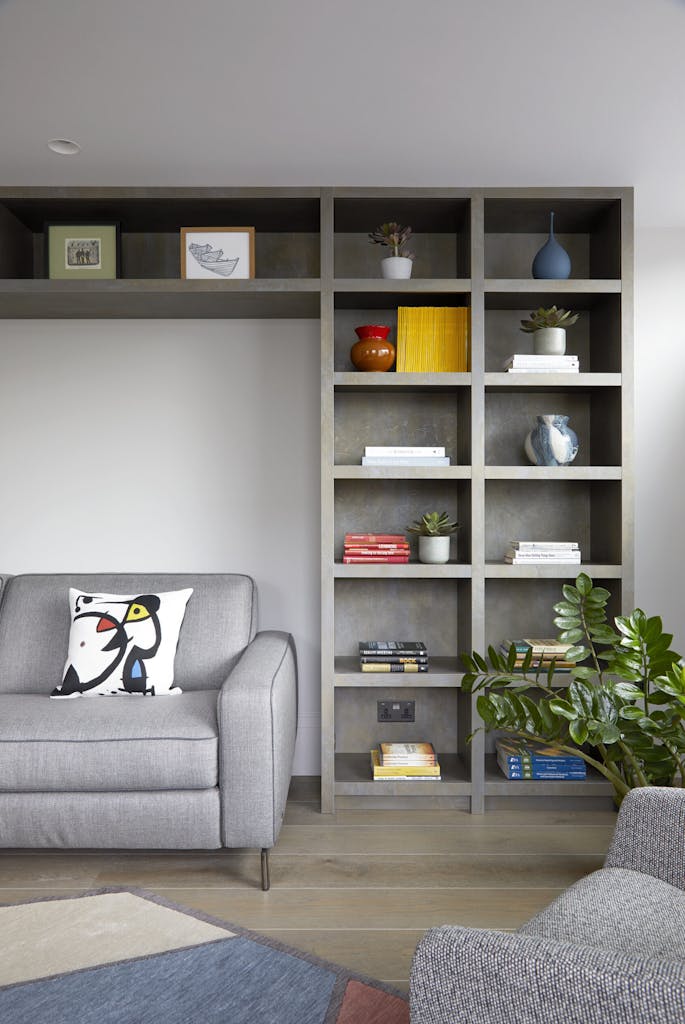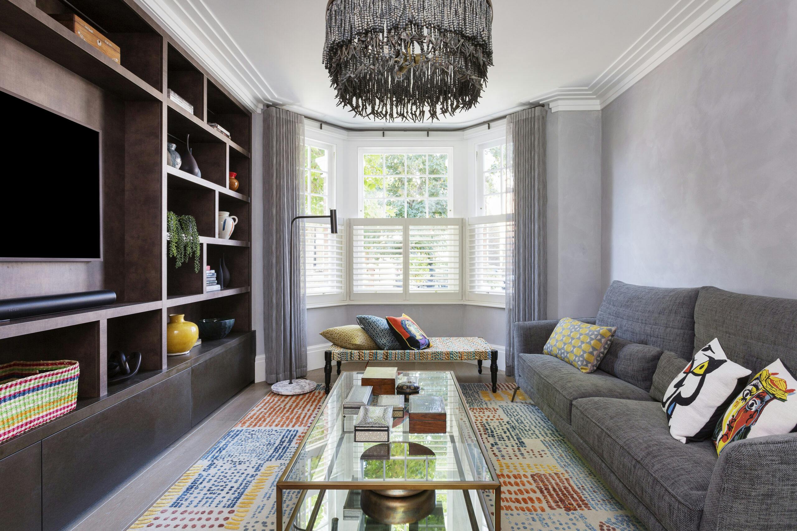 The front living room is decorated with colourful accessories, like a bespoke Jennifer Manners rug, and balanced by a full-width bespoke shelving unit created with HUX.