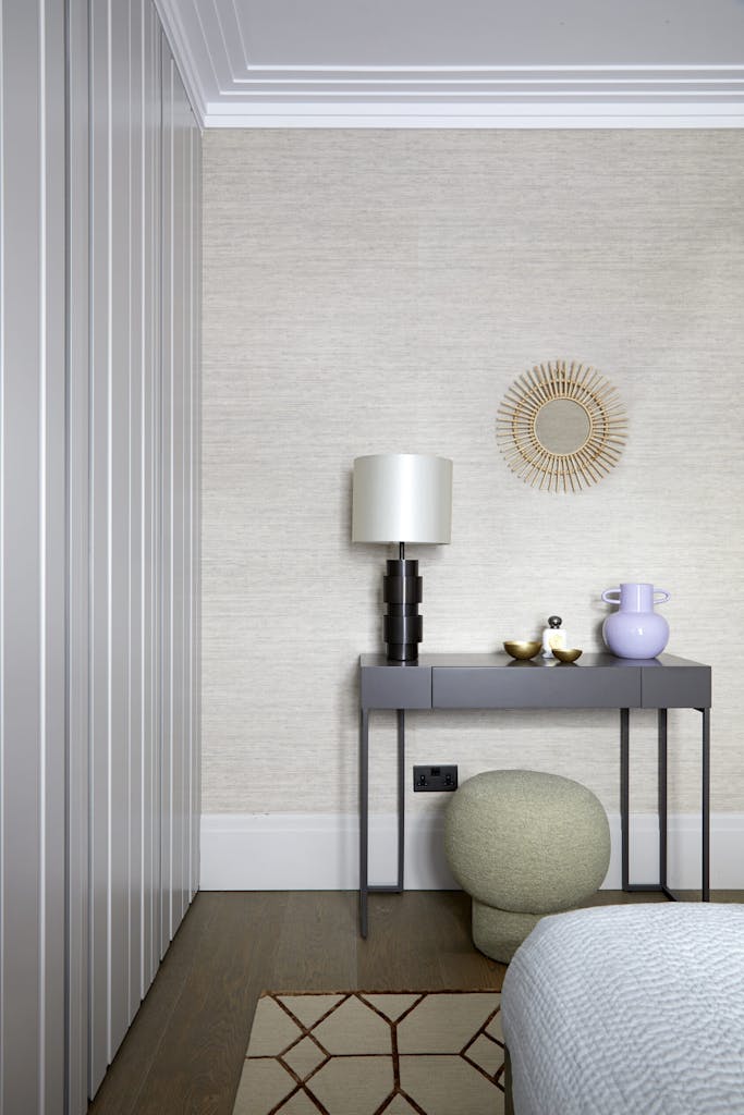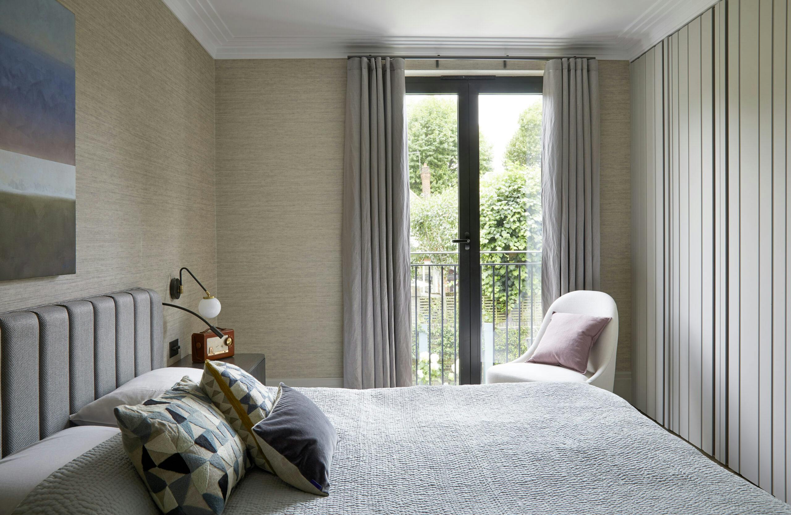 In here we added a bespoke HUX bed with floating bedside tables and created a feature wall with a beautiful textured wall covering. The ensuite is light and super luxe with faux concrete tiles and a double vanity by Scavolini Tratto with melamine worktop in Concrete Jersey.