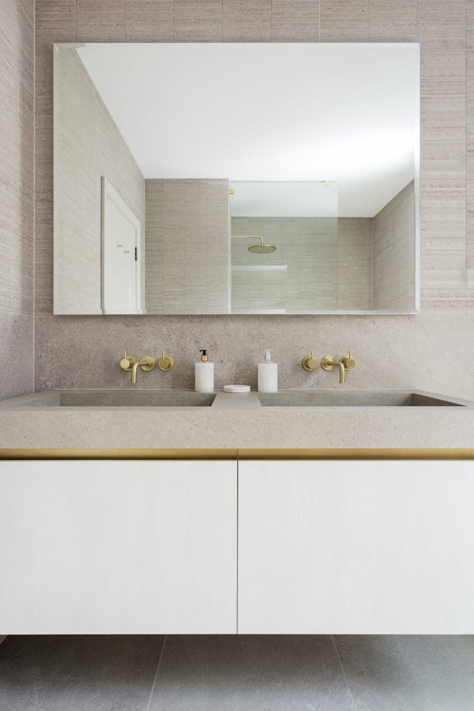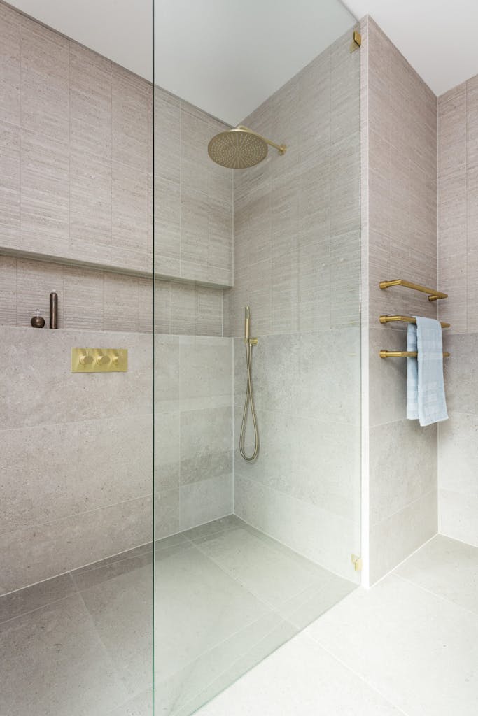 In this bathroom, the aim was to infuse an element of surprise into the otherwise neutral and textural space. Smart brass inlays embellish the cabinetry, a detail which is then continued through the taps, towel rail and shower fixtures. These details evoke the refined ambiance of a smart hotel bathroom.