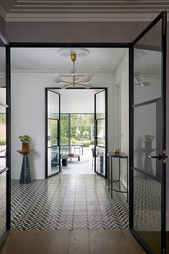 By combining the double-height entrance with a hallway in the centre of the property, we created a natural flow between the crittal doors to the front living room and the kitchen / family room to the rear, linking the spaces and creating a line of sight from the front room right through to the garden designed by Aoba Landscapes.