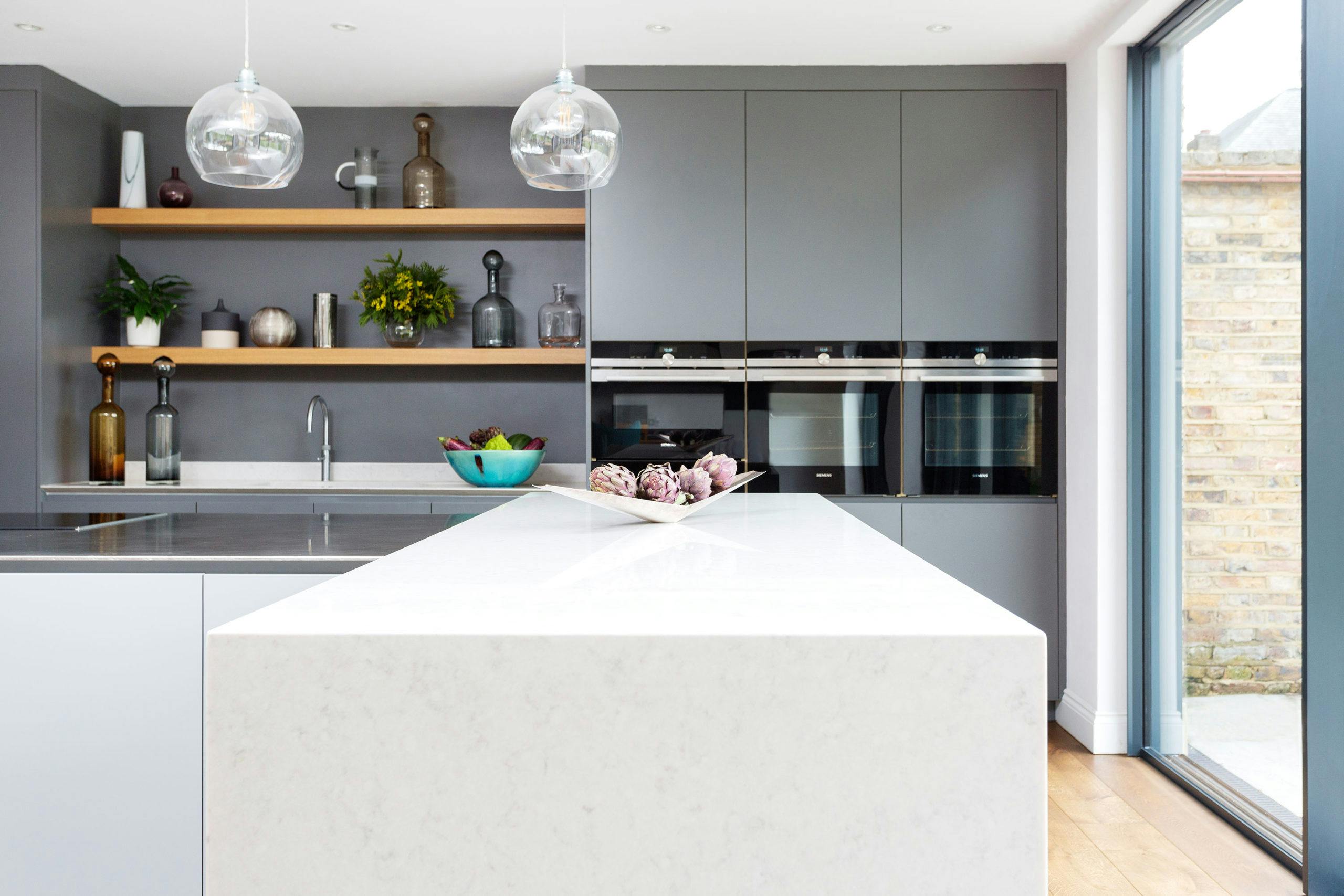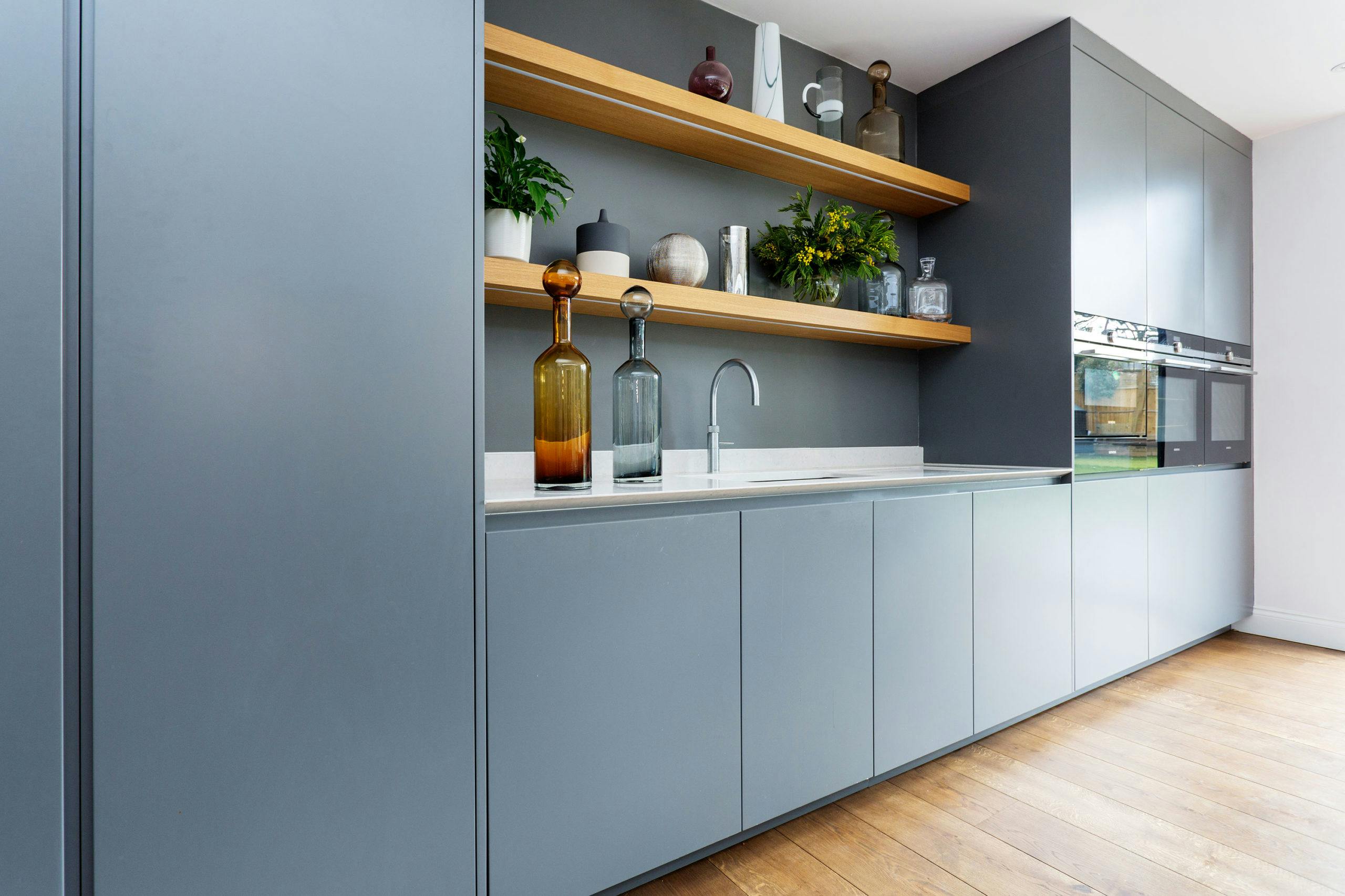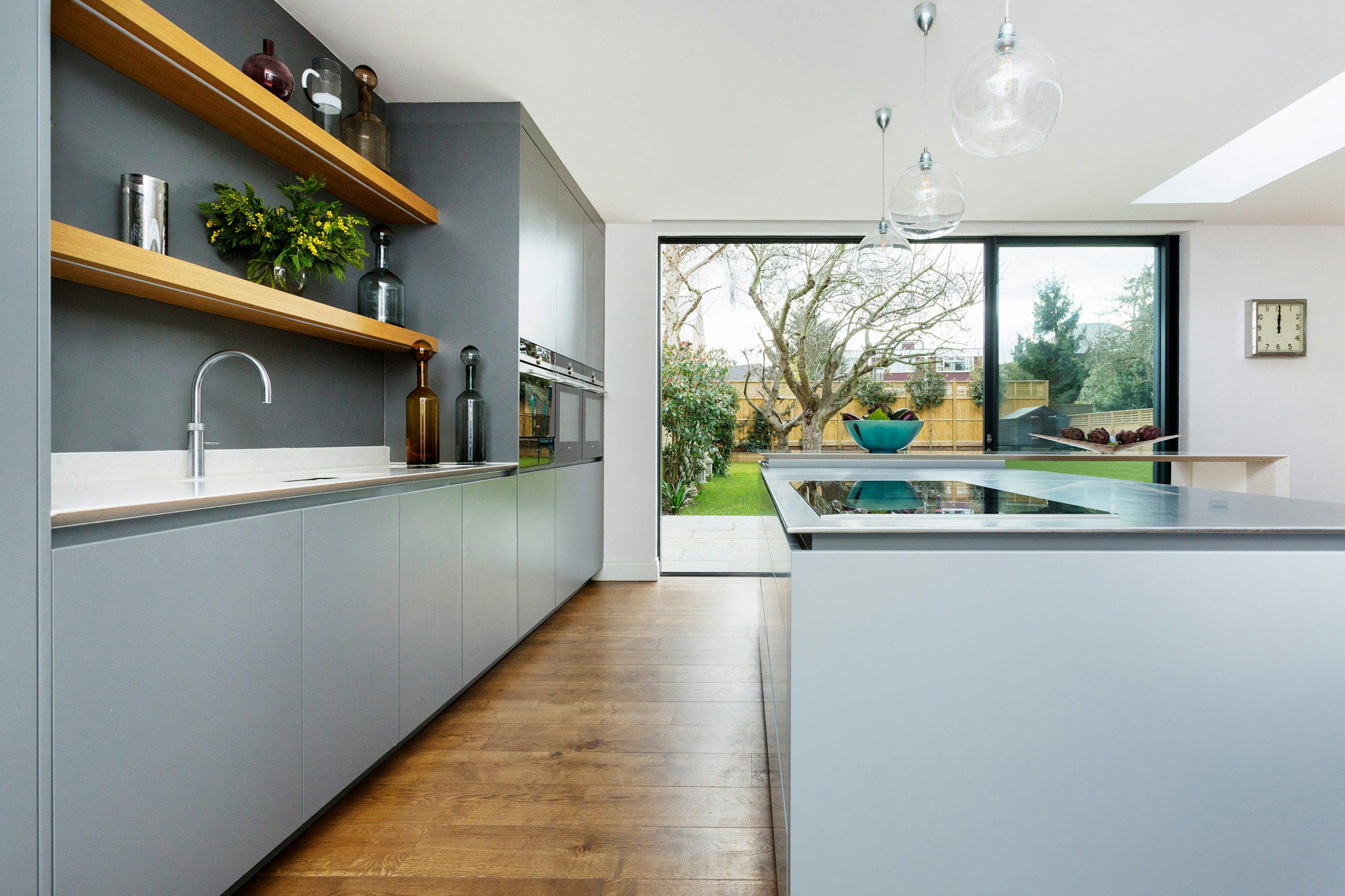In the light and airy kitchen, rich oak timber flooring is offset by muted two-tone grey matt lacquer cabinetry and a two-tiered stainless-steel shark-nosed island and white quartz breakfast bar at a 90 degree angle, designed by kitchen specialists HUX London.