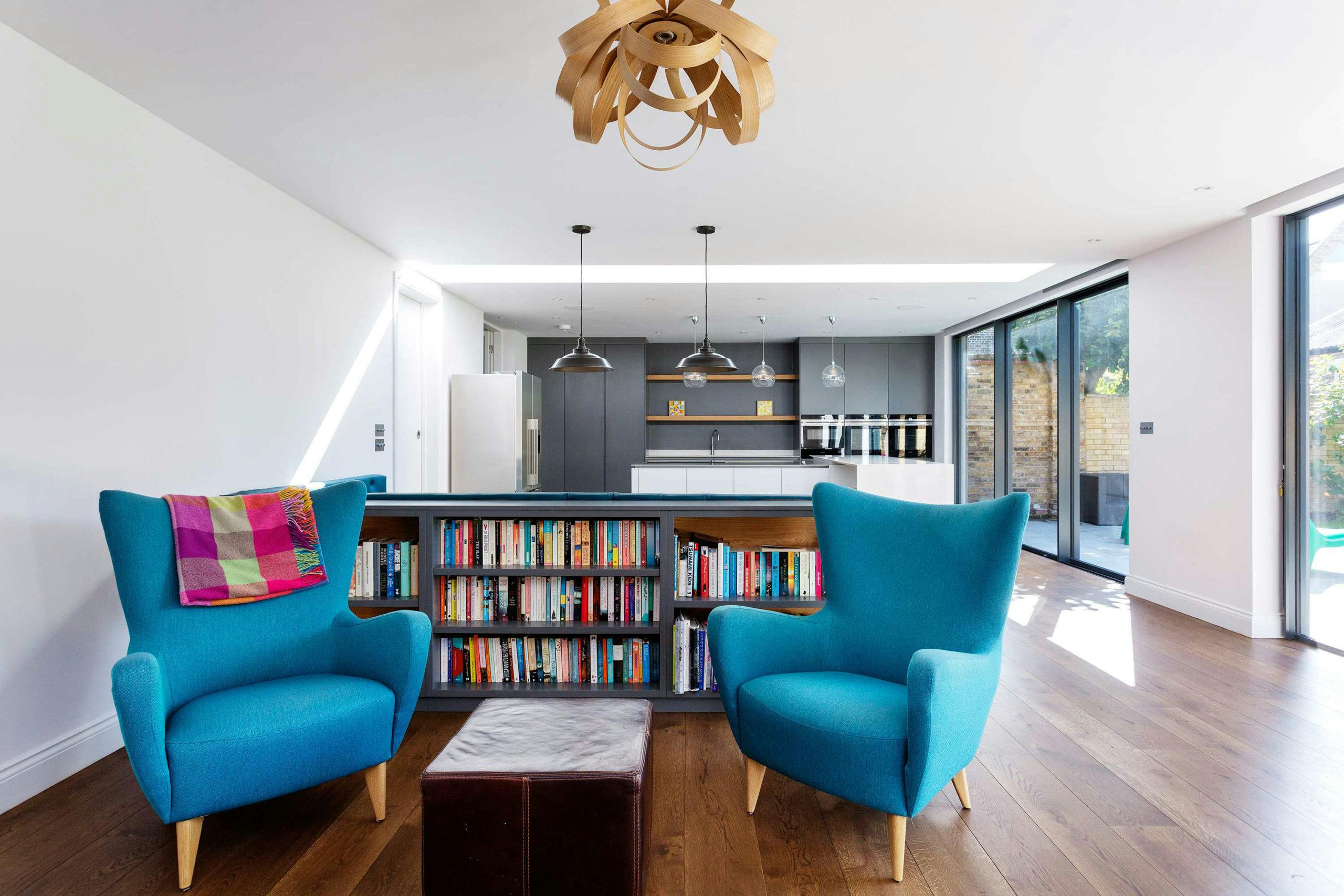 On the ground floor, the new proportions allowed the rear of the property to accommodate a huge kitchen, dining area and informal living space, with two huge sets of floor-to-ceiling glass doors leading to the garden and a long contemporary skylight zoning the areas.