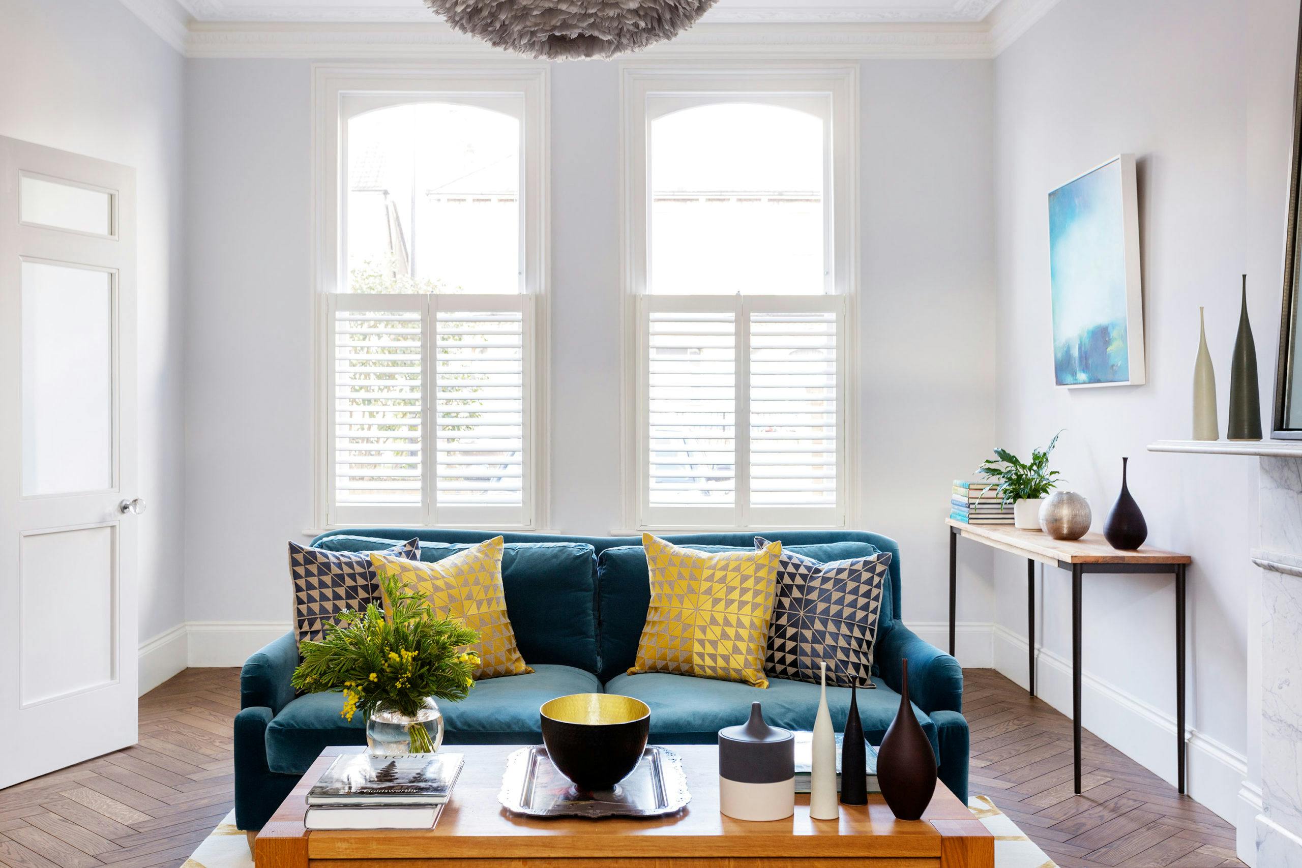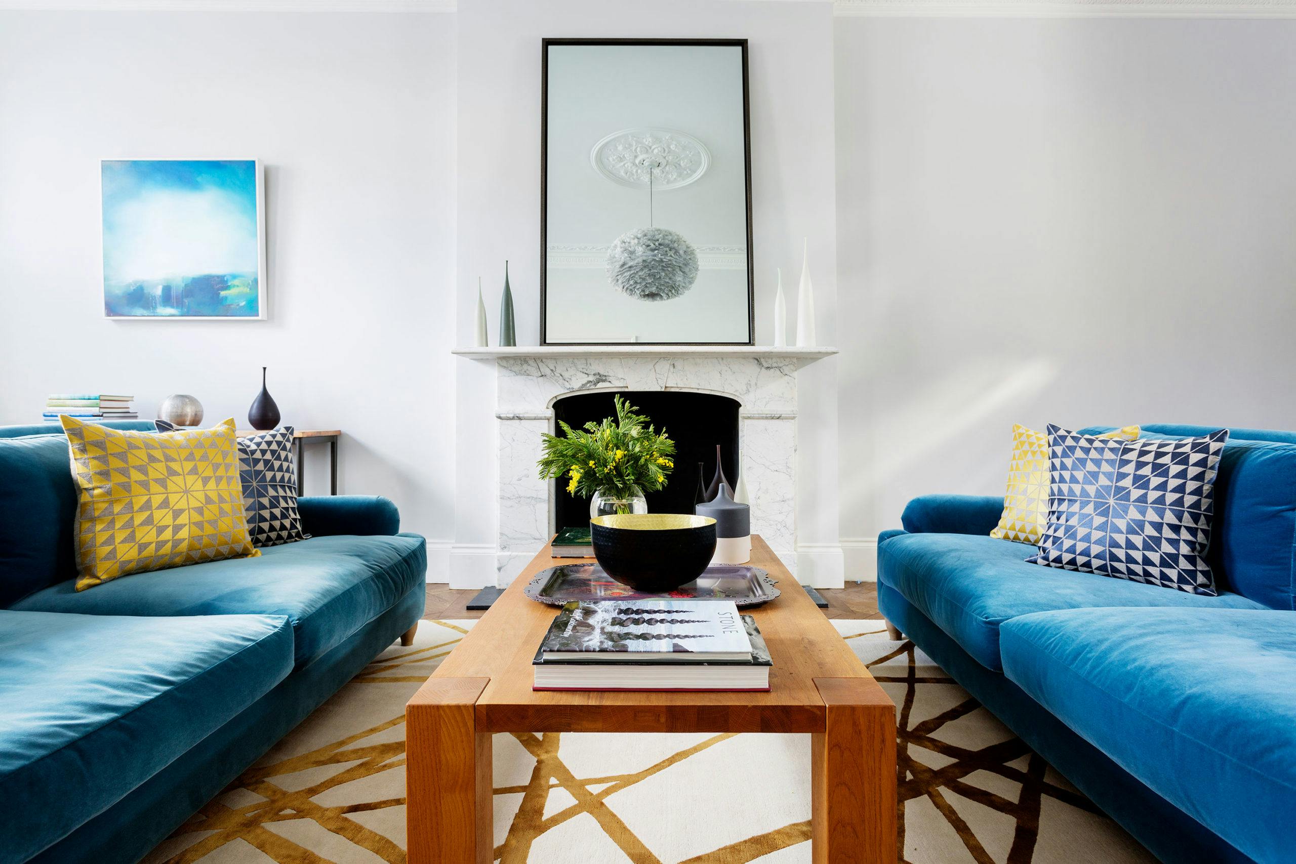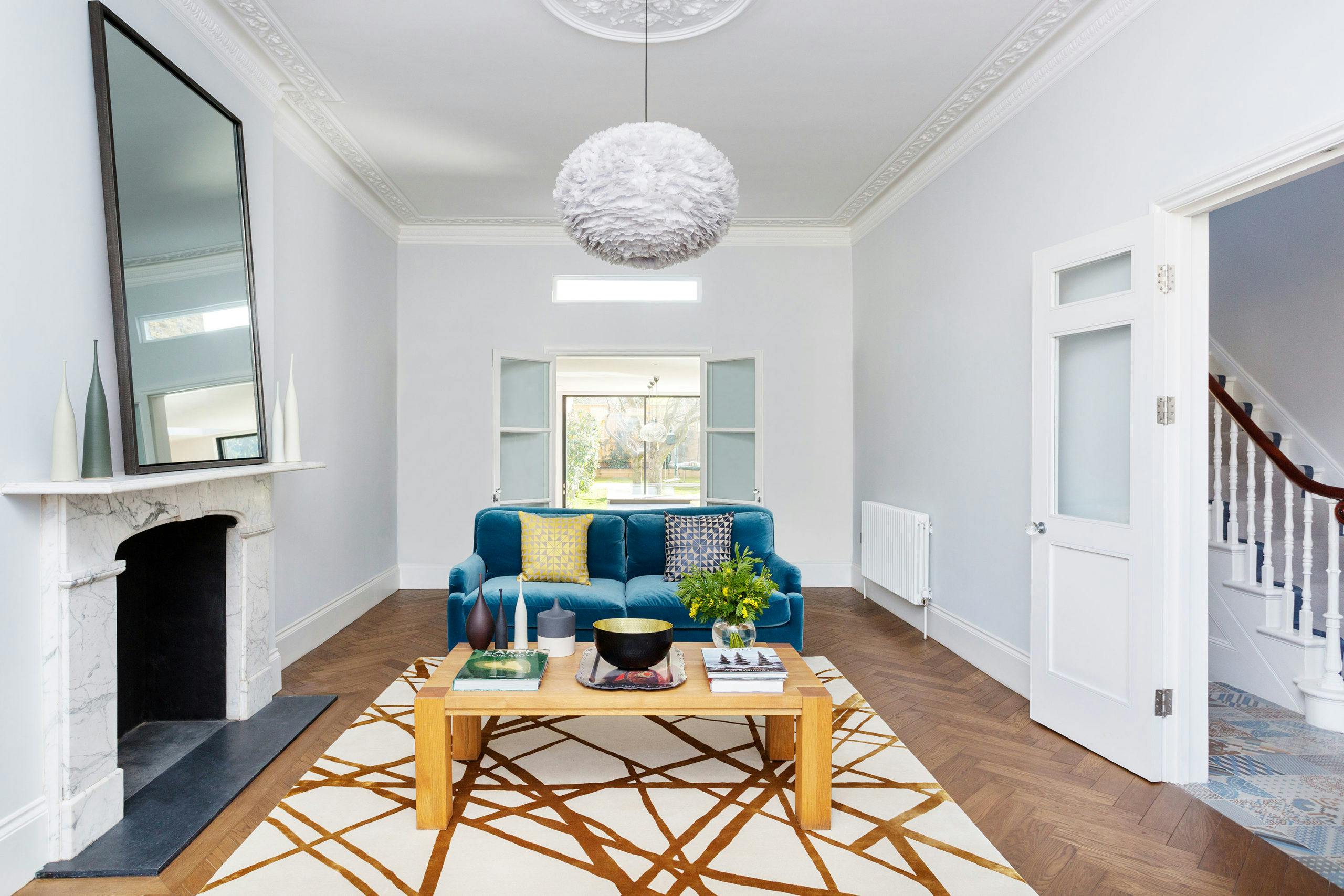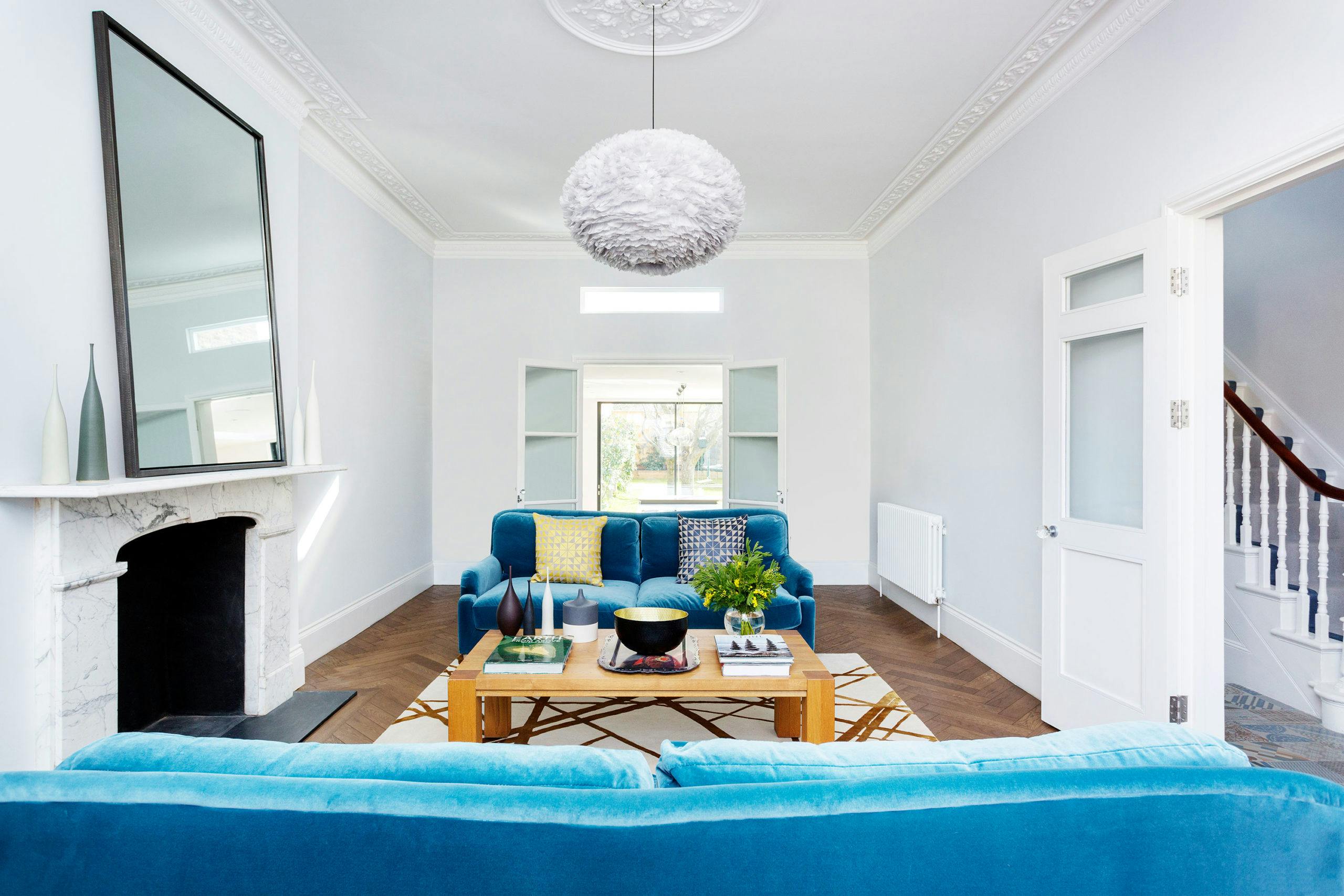 The formal sitting room at the front of the house retains its period features and is enlivened with a fresh and refined scheme which includes two peacock blue sofas, a stunning Kelly Wearstler rug and a fabulous feathery pendant light.