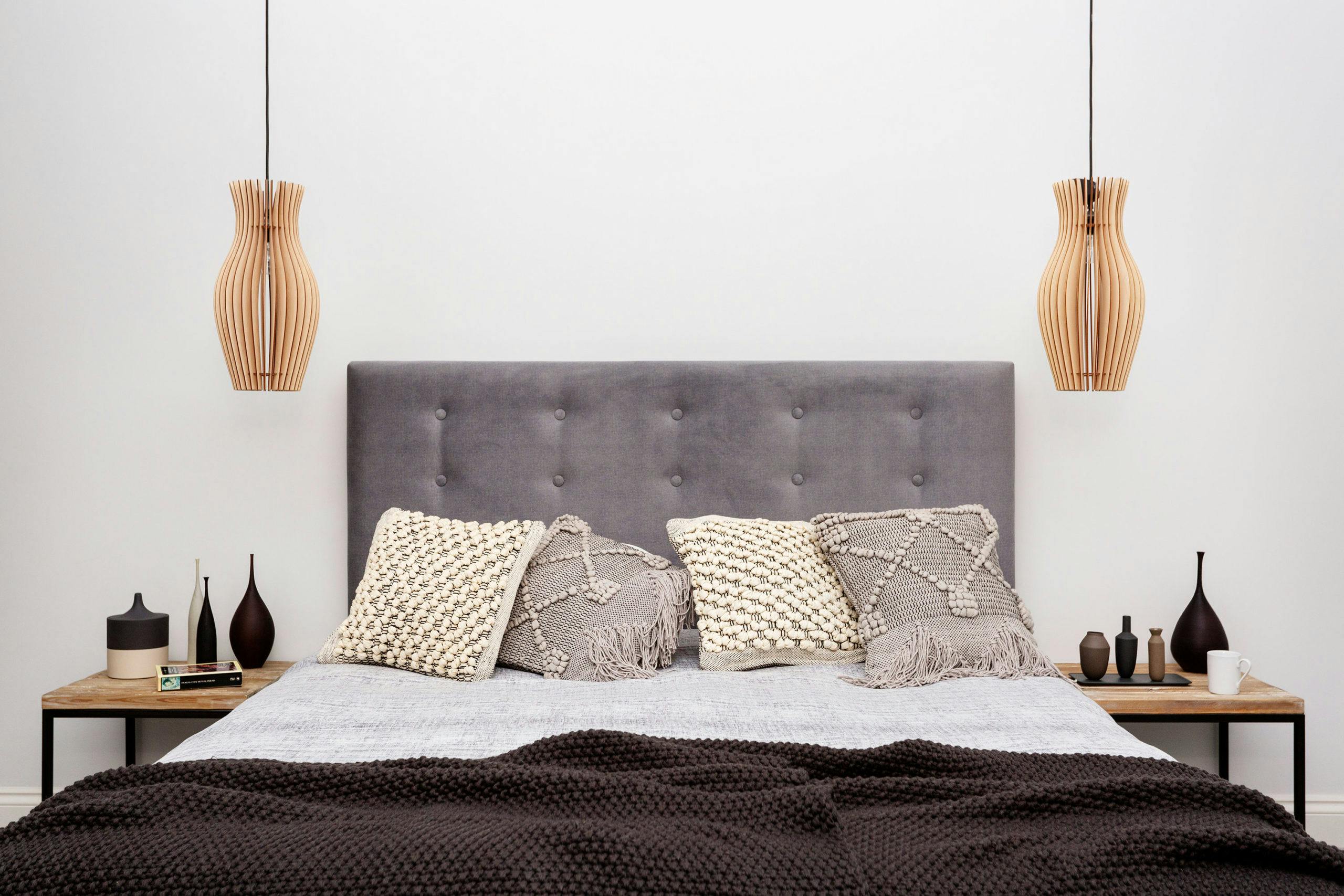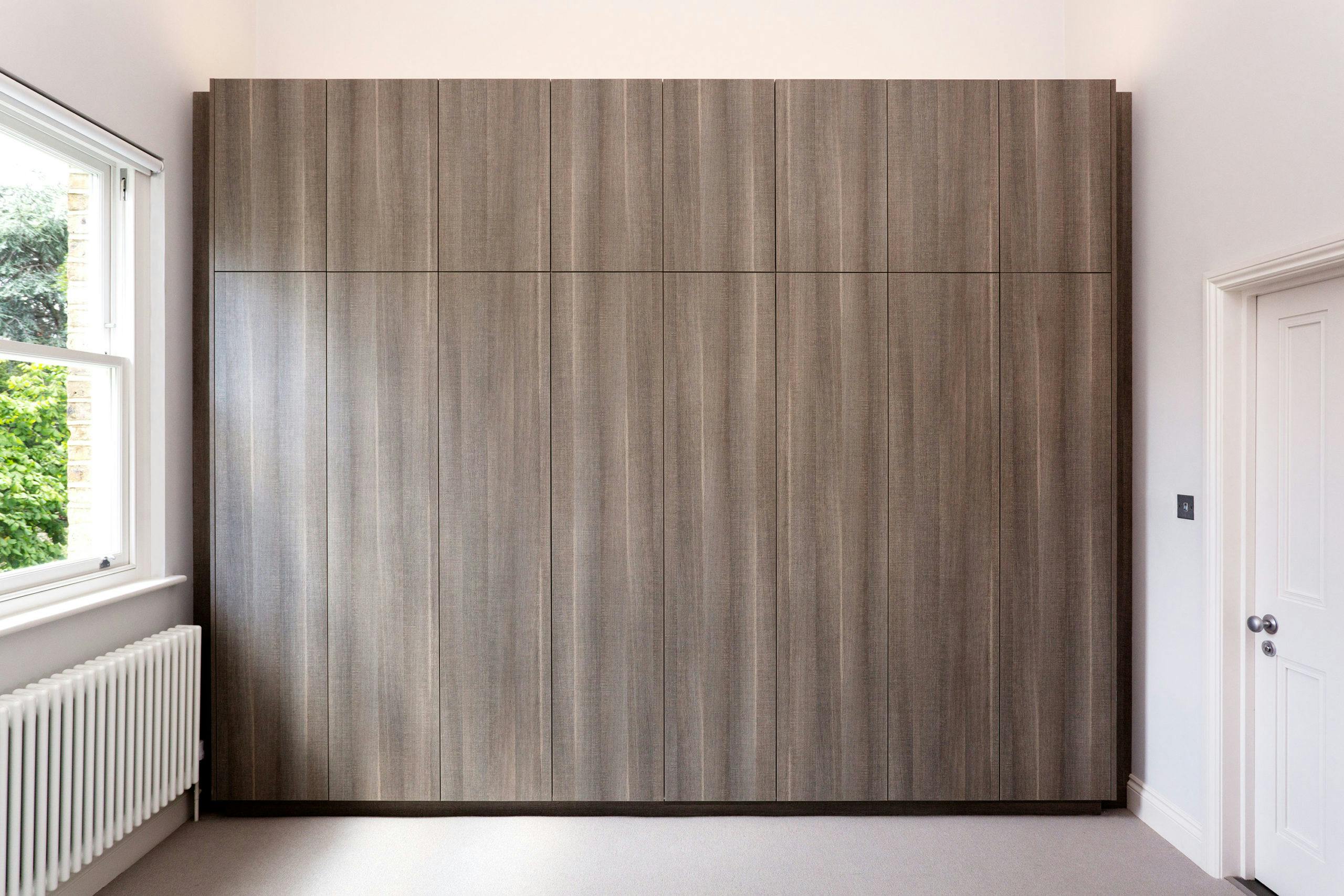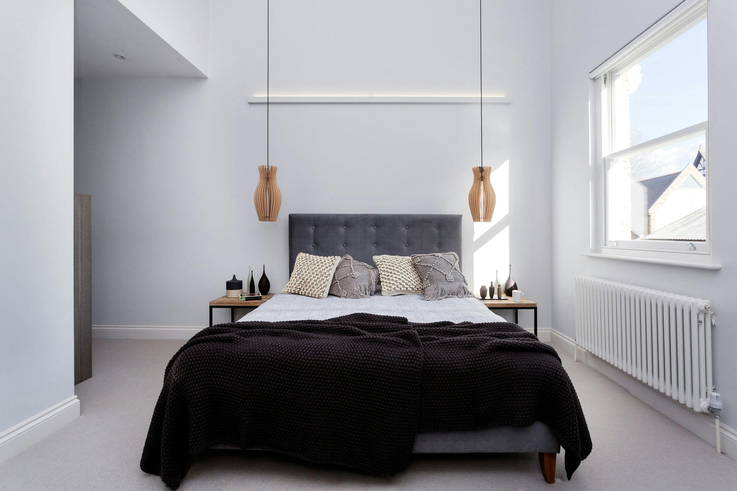 Two bespoke roof lights flank the external walls of the first floor extension, providing a line of sight up the reclaimed brick wall from the ground floor open living space. In the master bedroom, the walls are washed in a soft grey against which rich natural materials, sumptuous textures and dark neutral hues stand out.