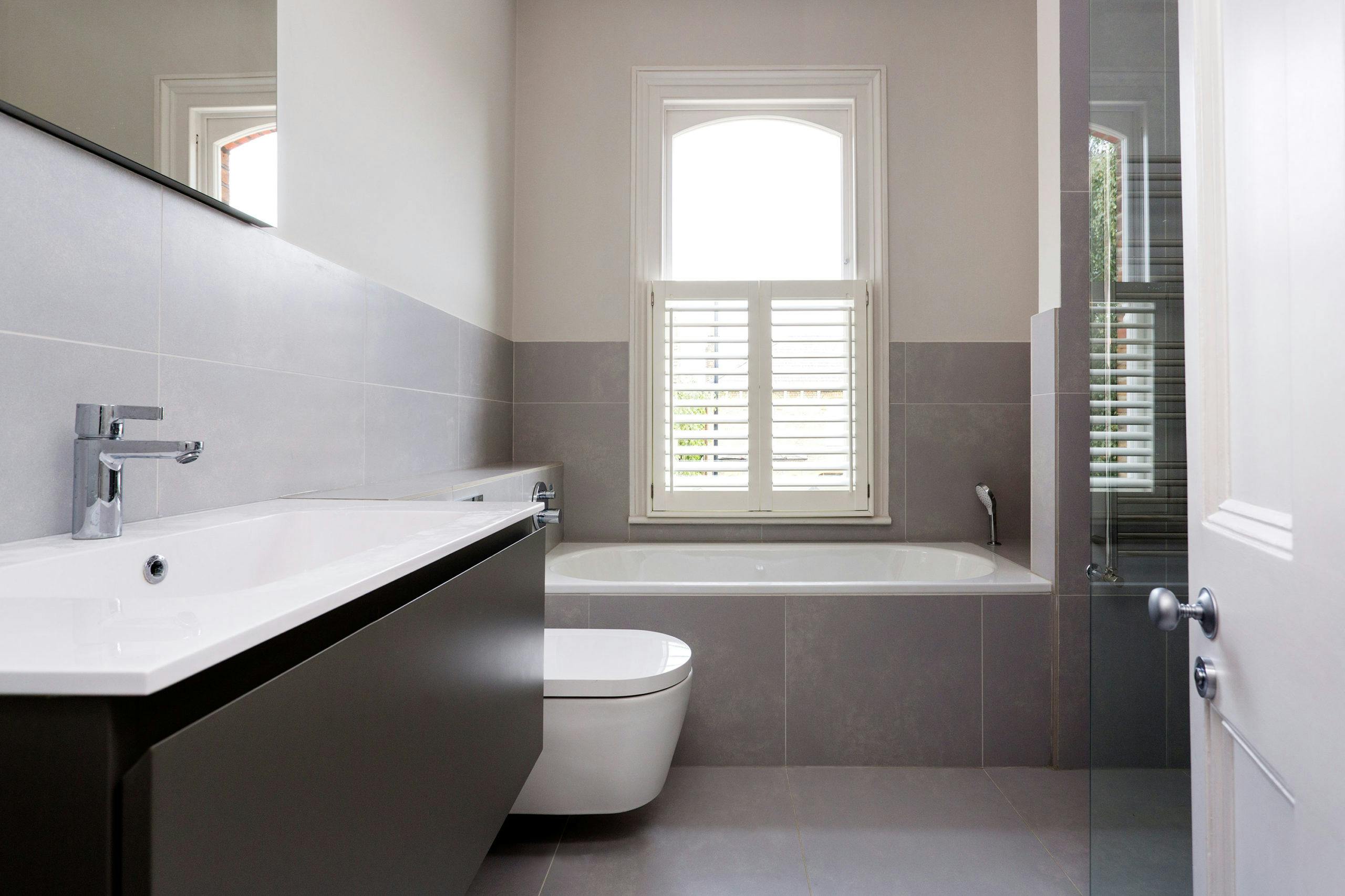 The en-suite has a calm, neutral palette and sleek contemporary finishes continuing the cool and contemporary look.
