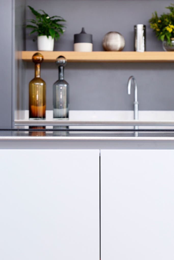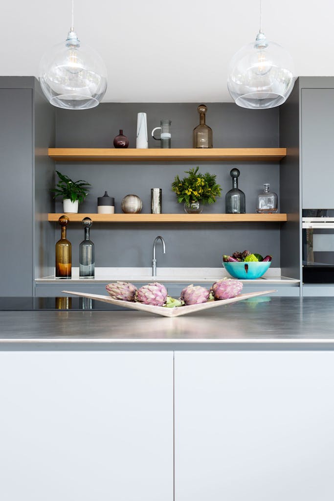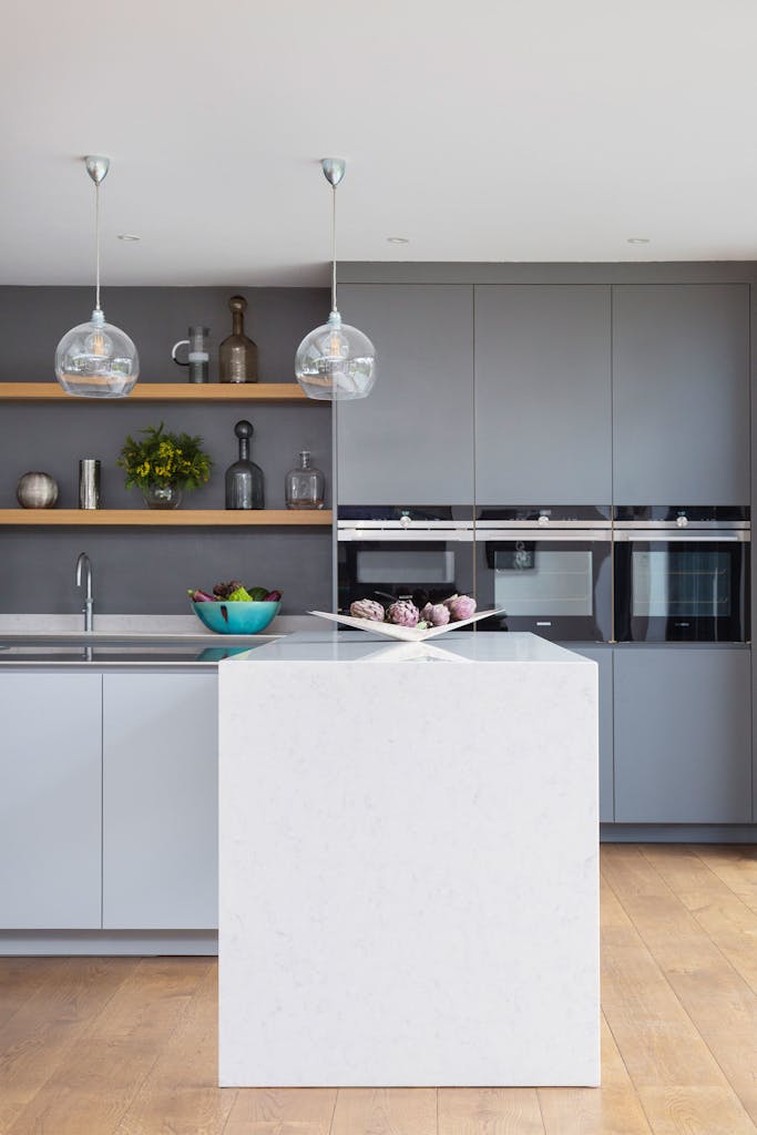 In the light and airy kitchen, rich oak timber flooring is offset by muted two-tone grey matt lacquer cabinetry and a two-tiered stainless-steel shark-nosed island and white quartz breakfast bar at a 90 degree angle, designed by kitchen specialists HUX London.