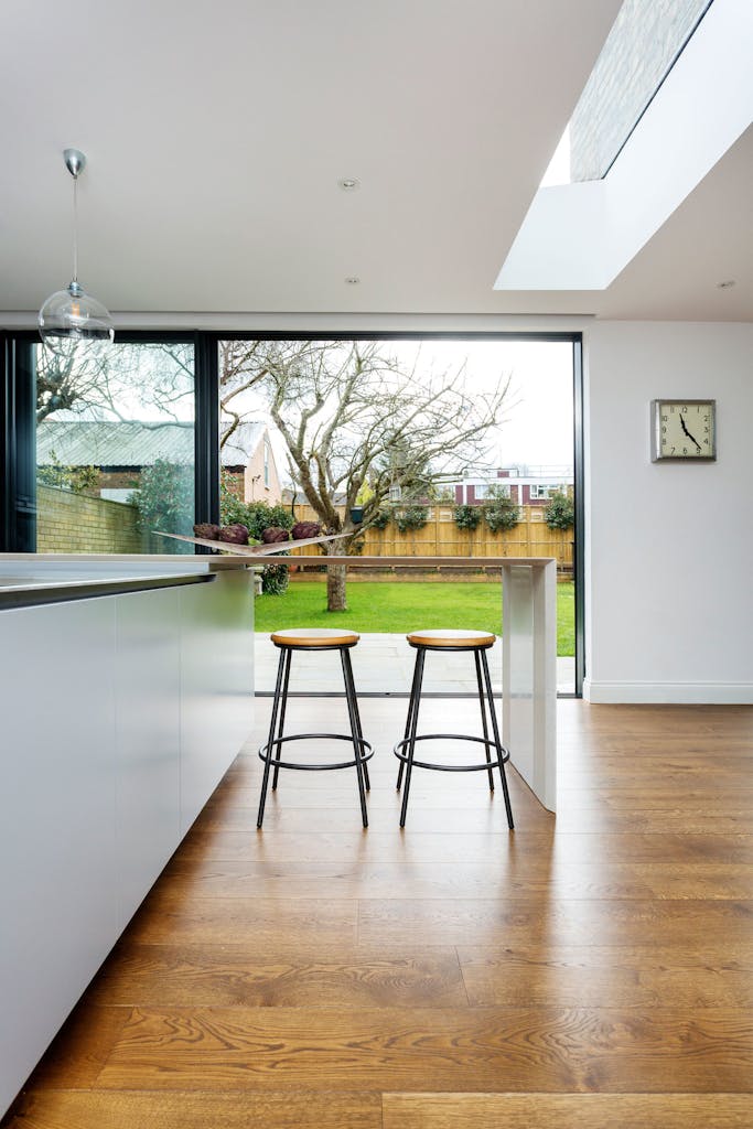 On the ground floor, the new proportions allowed the rear of the property to accommodate a huge kitchen, dining area and informal living space, with two huge sets of floor-to-ceiling glass doors leading to the garden and a long contemporary skylight zoning the areas.