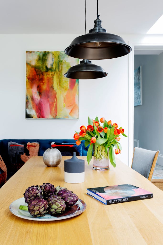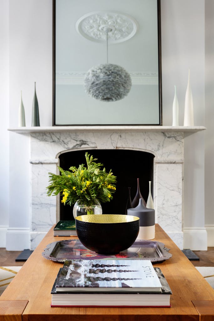 The formal sitting room at the front of the house retains its period features and is enlivened with a fresh and refined scheme which includes two peacock blue sofas, a stunning Kelly Wearstler rug and a fabulous feathery pendant light.