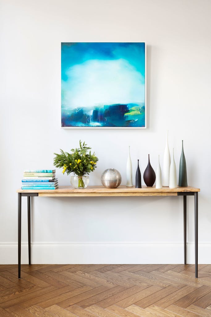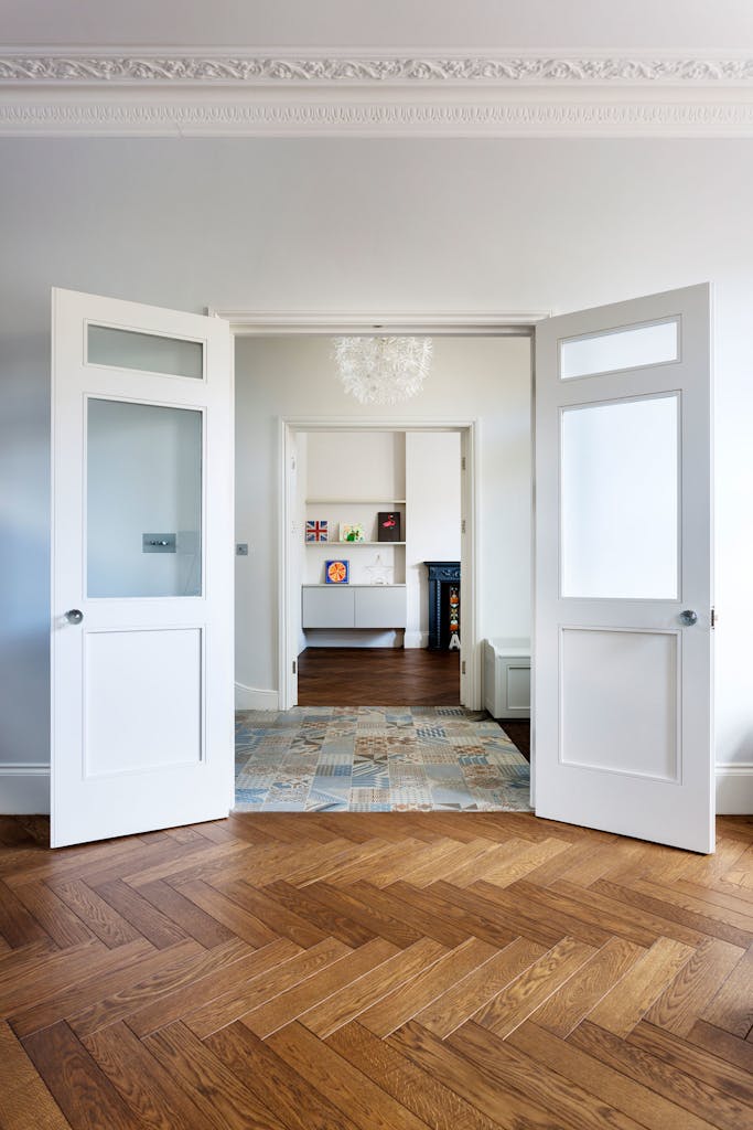 A beautiful patchwork of patterned muted blue and earthy toned porcelain tiles runs through the hallway connecting the front and rear parts of the house.