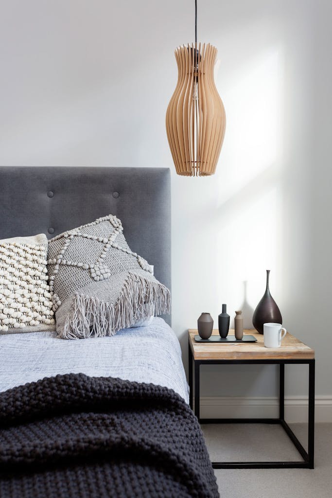 Two bespoke roof lights flank the external walls of the first floor extension, providing a line of sight up the reclaimed brick wall from the ground floor open living space. In the master bedroom, the walls are washed in a soft grey against which rich natural materials, sumptuous textures and dark neutral hues stand out.